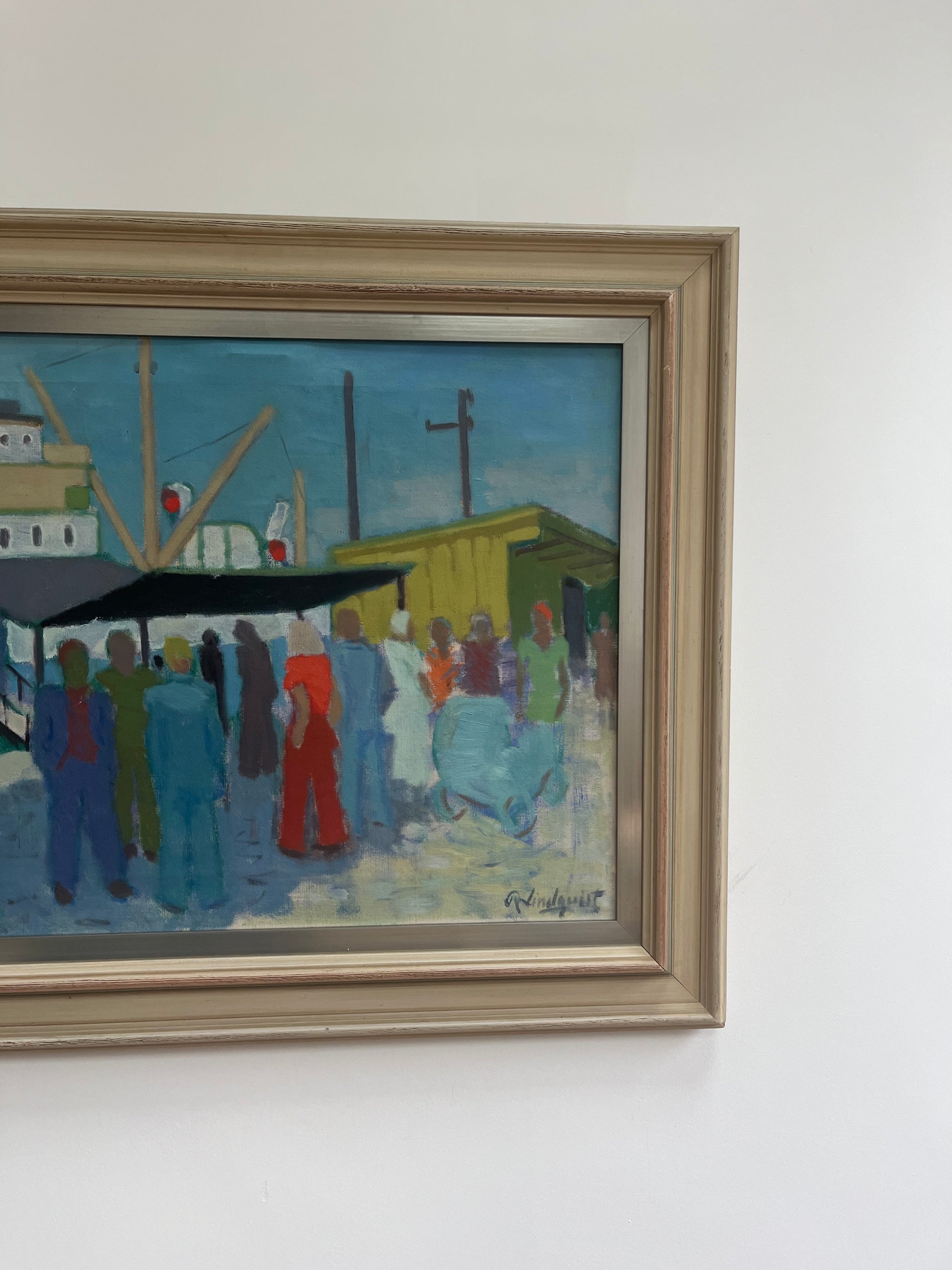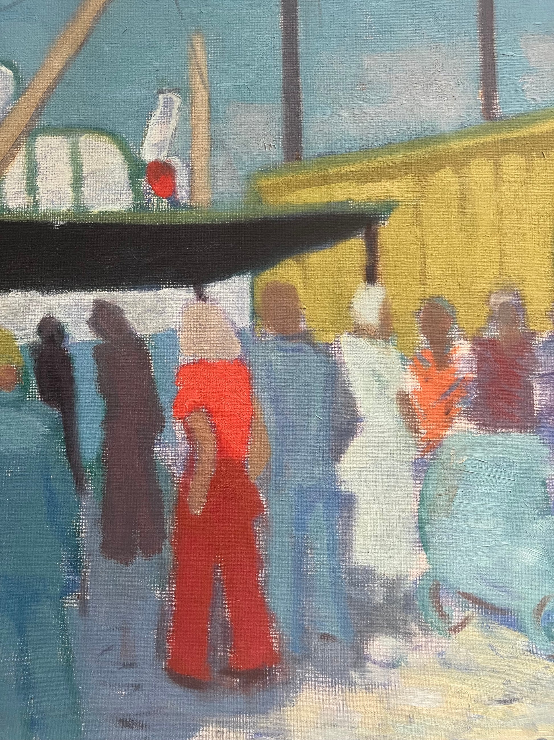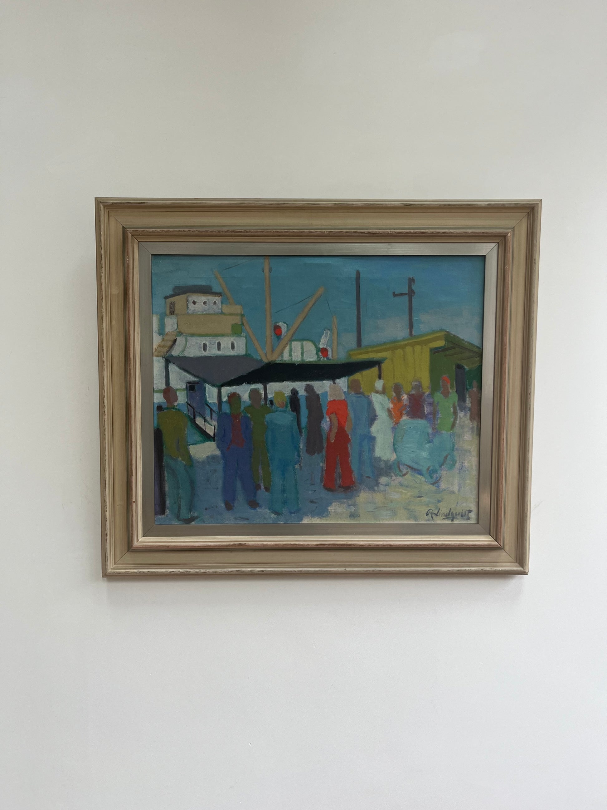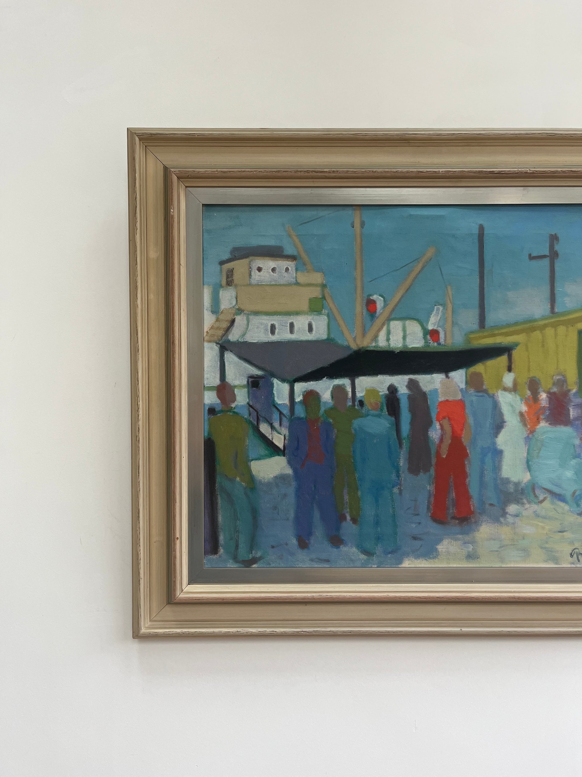 Amazing harbour scene of people gathering by a boat. Excellent pops of bright colours.