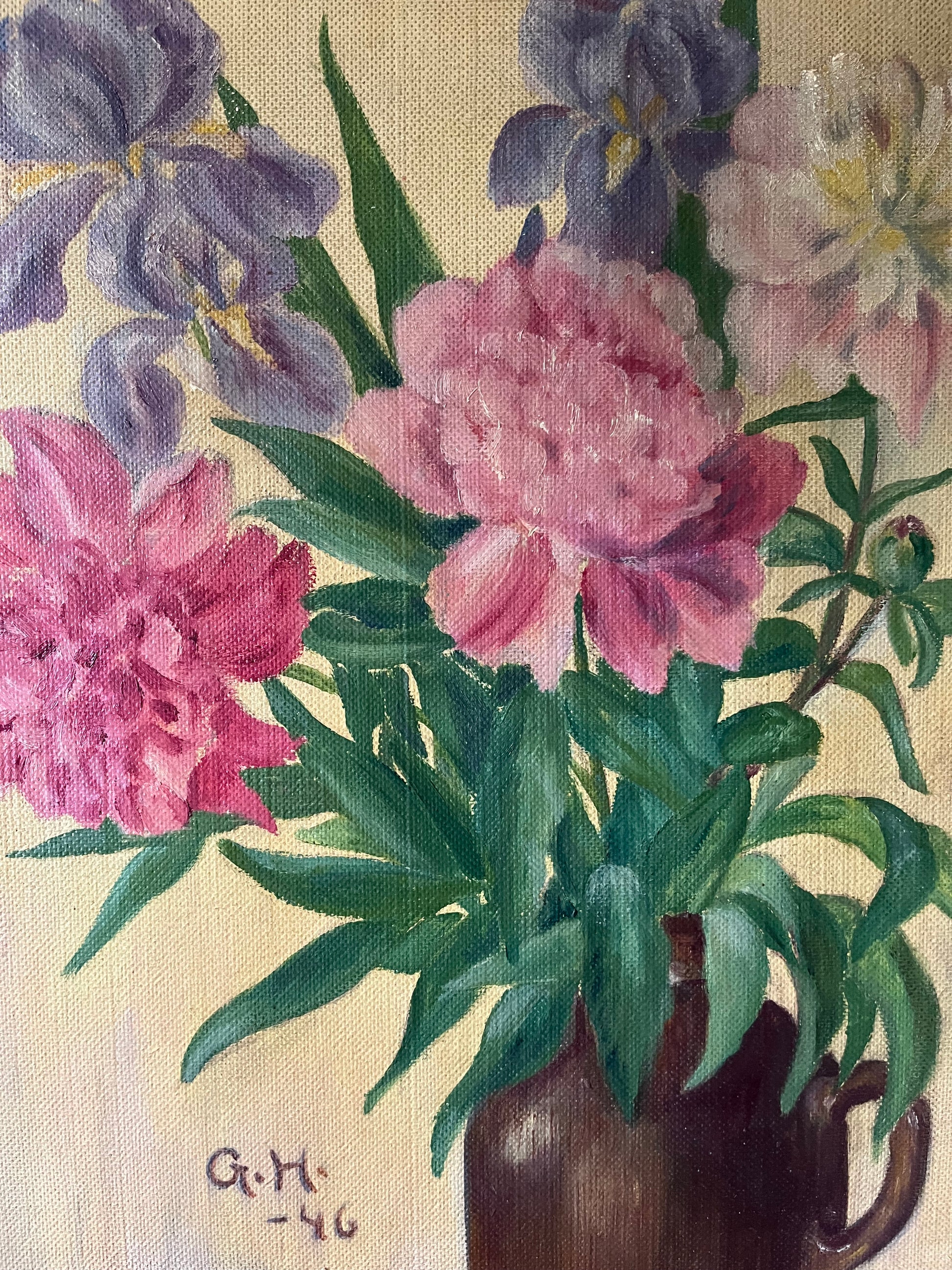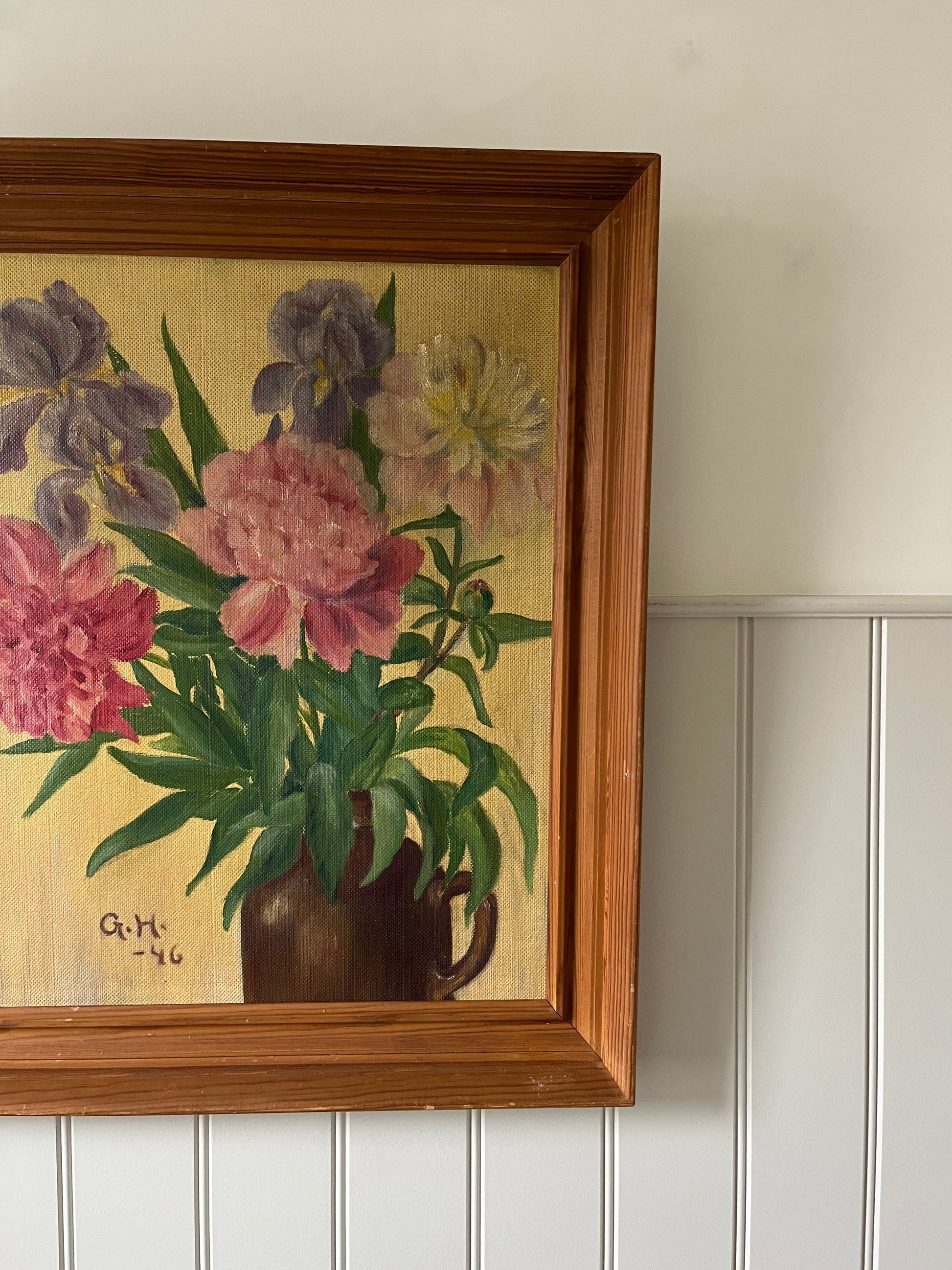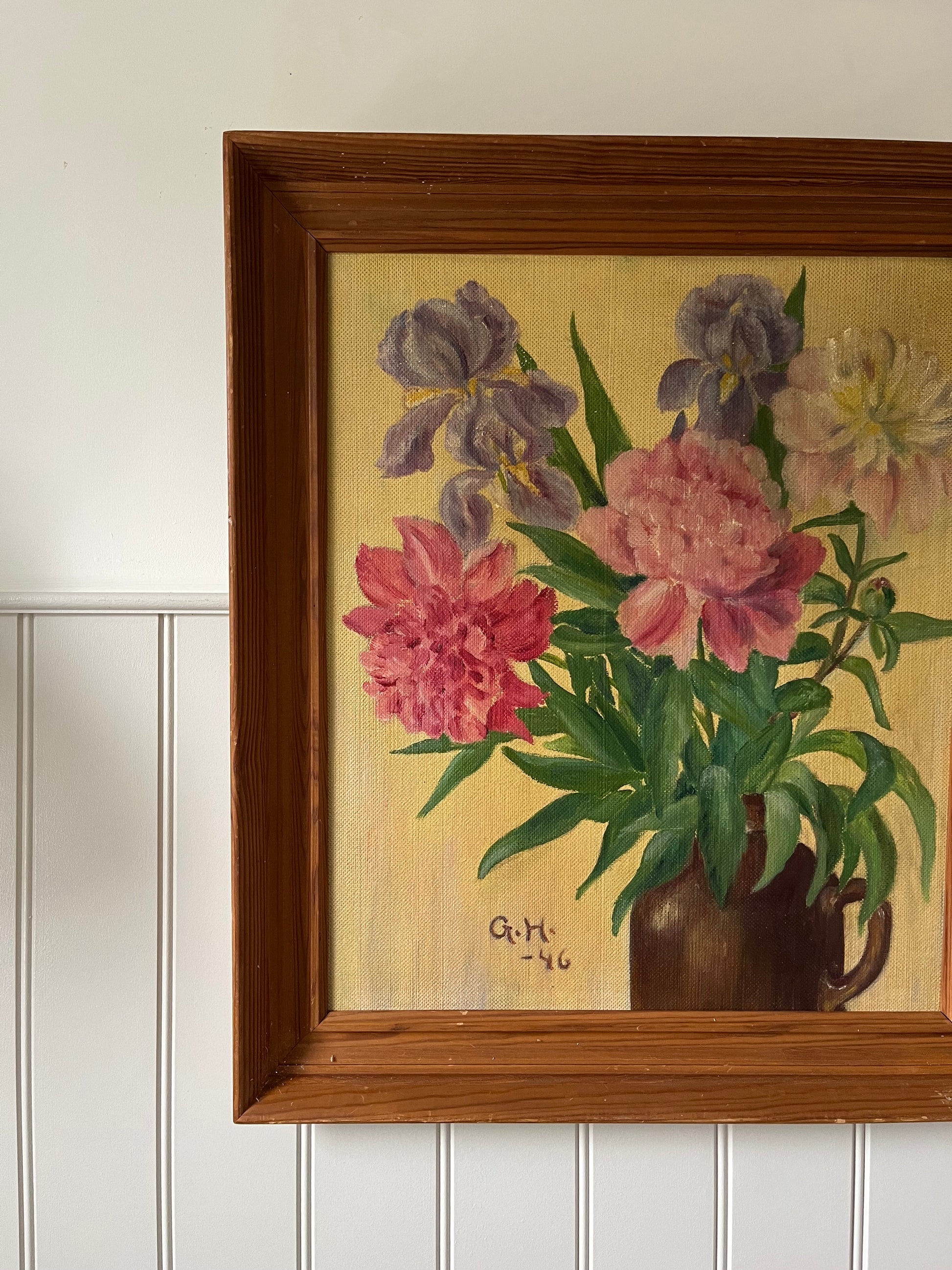 Beautiful blousy blooms in a lovely simple natural wood frame. Really lovely buttery yellow back drop too.