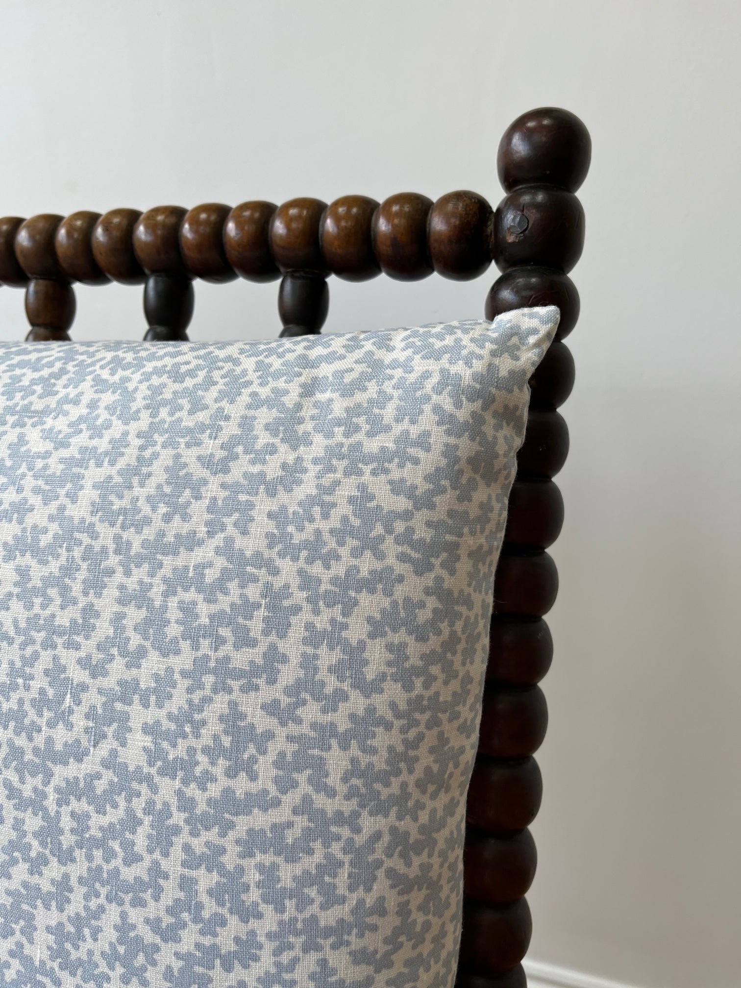Newly reupholstered in a beautiful pale blue Colefax and Fowler Seaweed, Old blue linen fabric. Double piping details are stunning and the back cushion has the original horse hair and is a nice a sturdy cushion for back support.