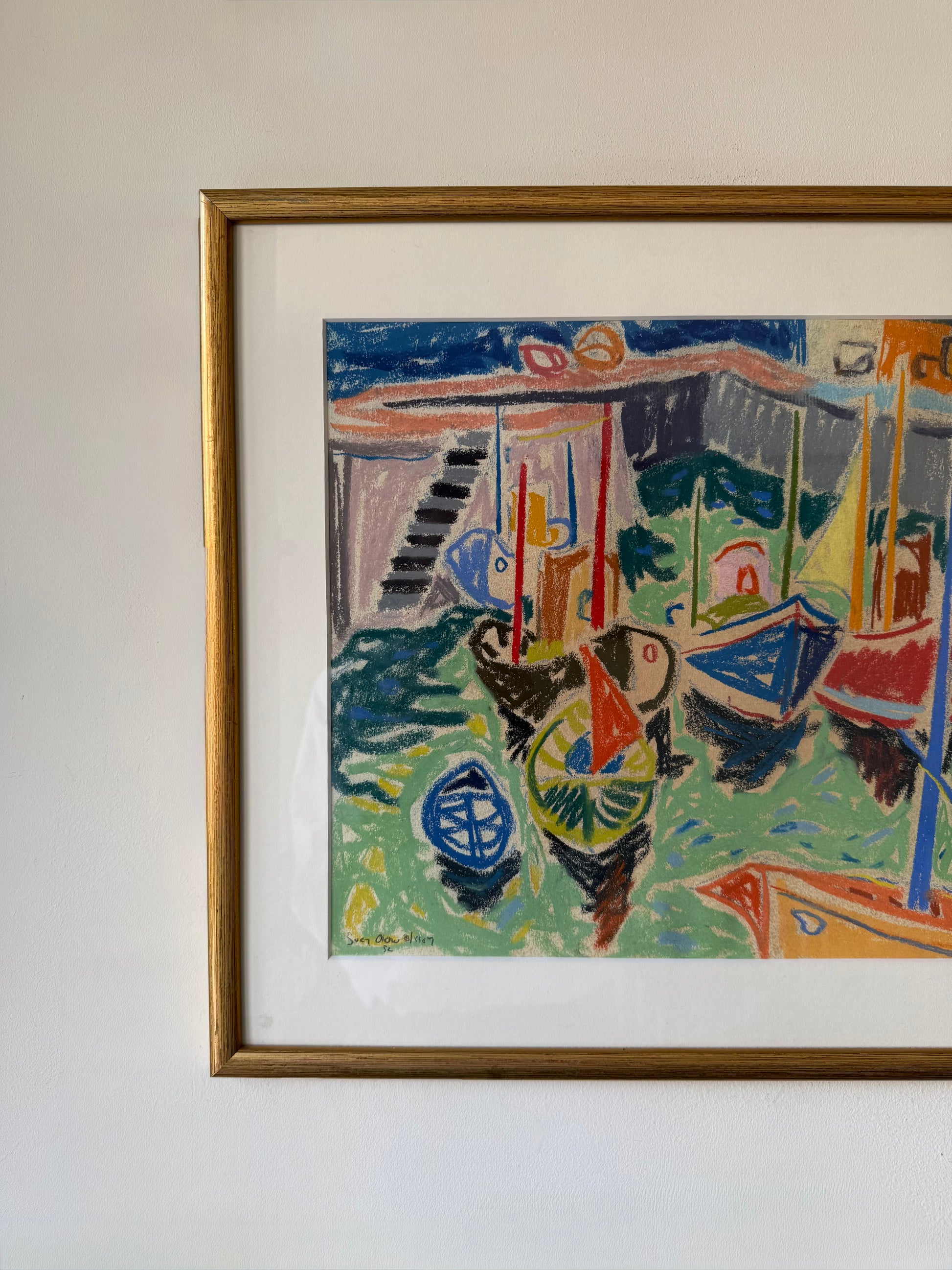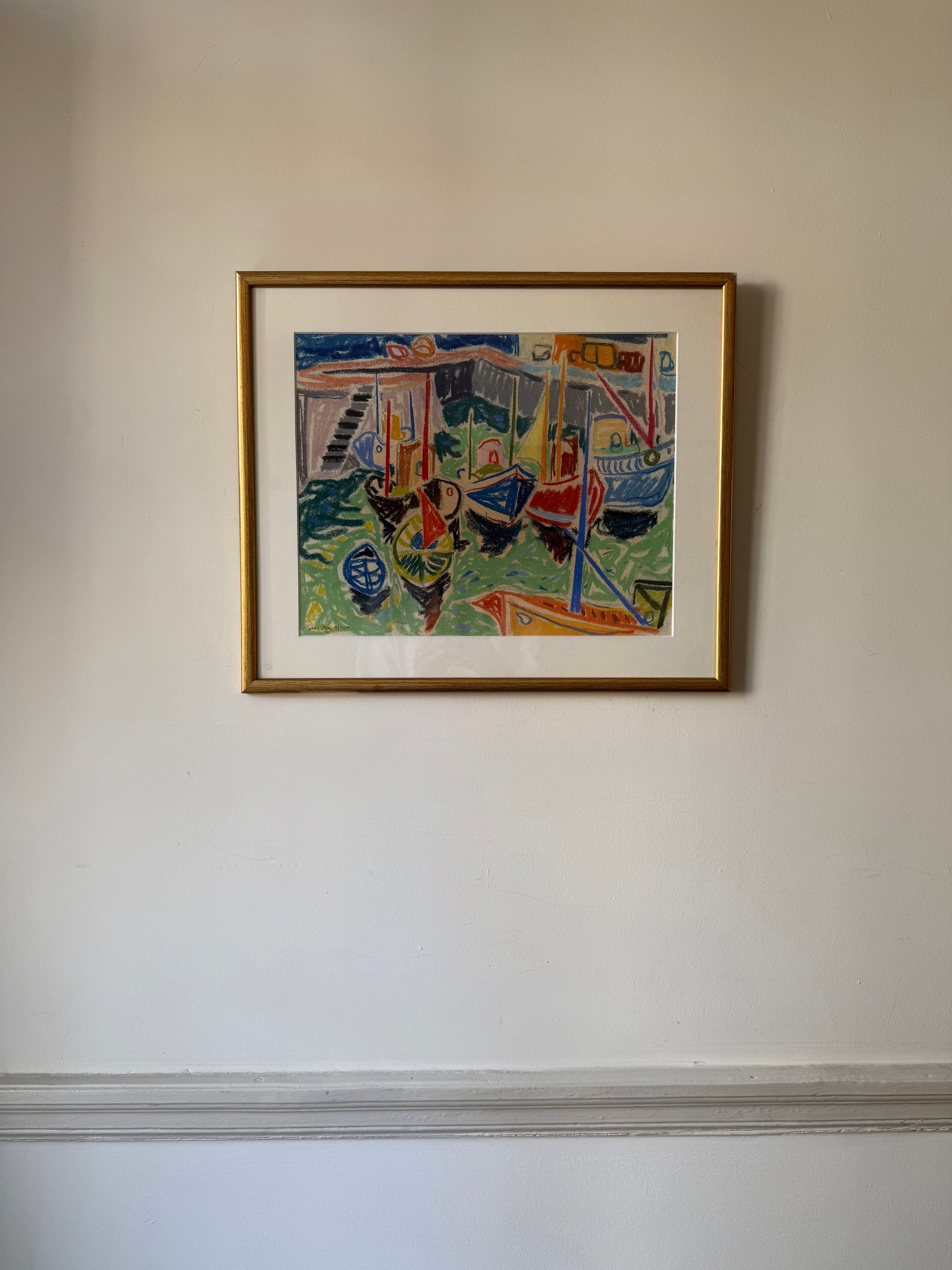 Lovely pastel behind a glazed frame. Some great primary colours.