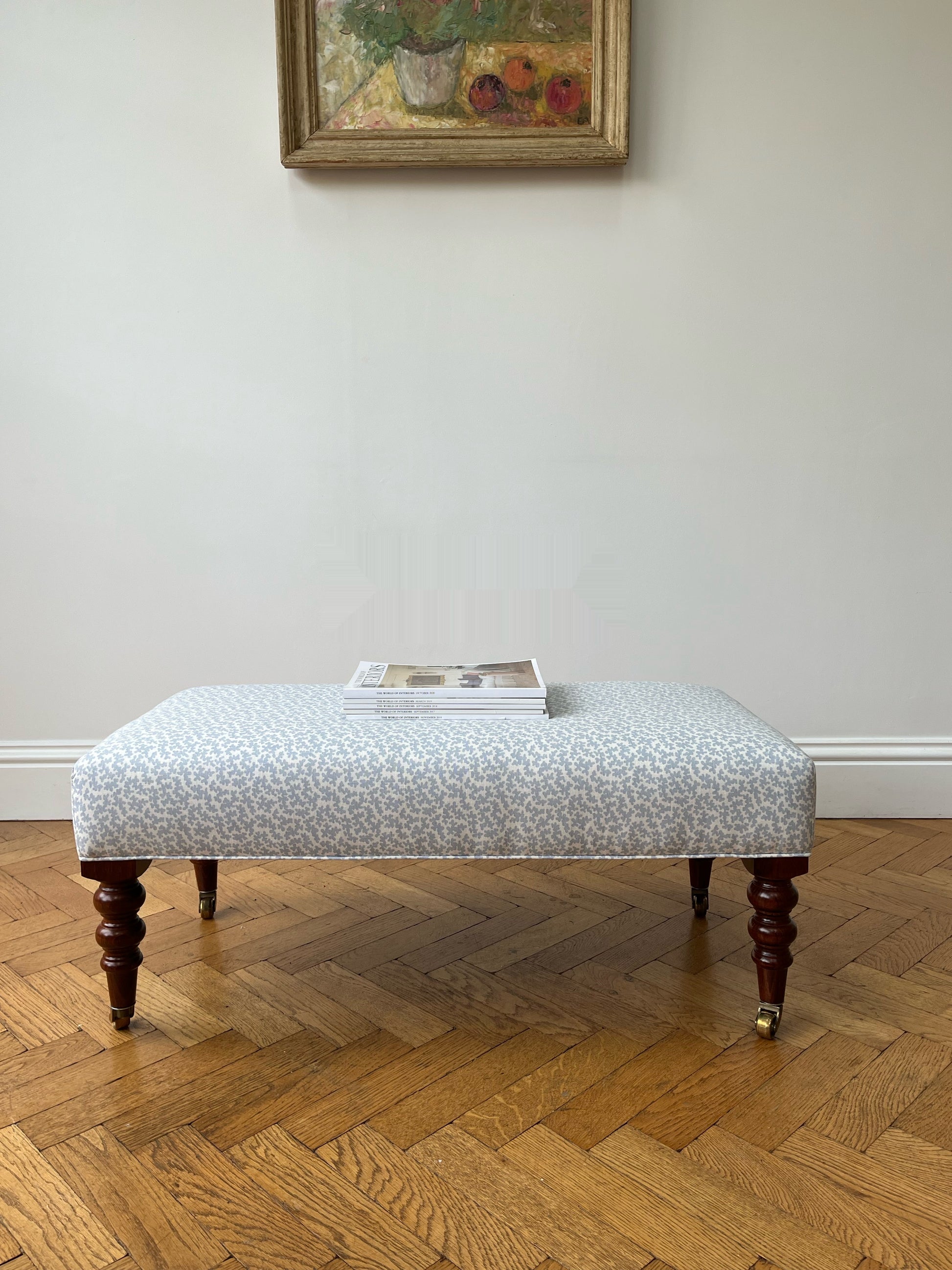 Newly re-upholstered footstool with beautiful Colefax and Fowler fabric in Seaweed Old Blue Linen. Lovely piping details featured too.
