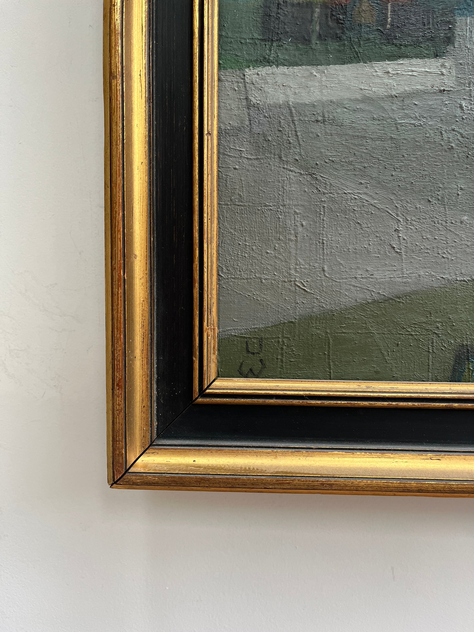 Incredible cubist piece with amazing colour combinations. A scene of a small town with rolling hills in the background.