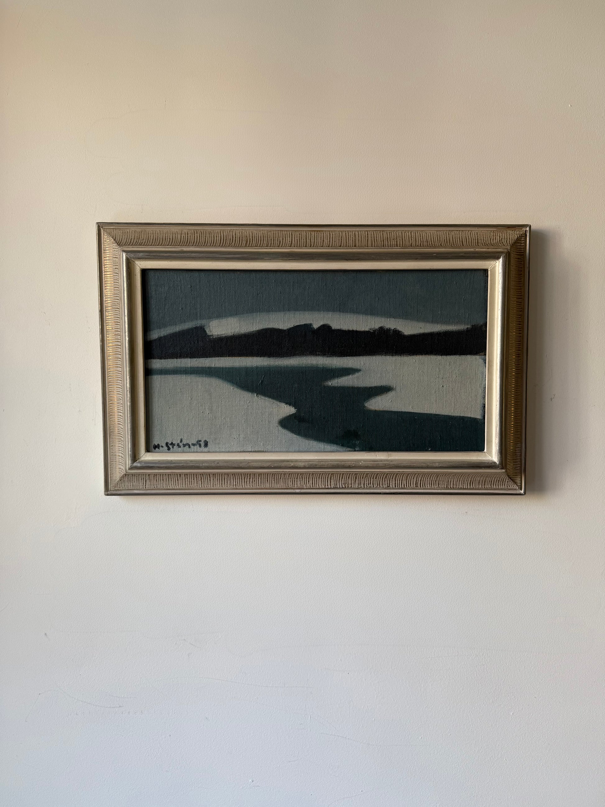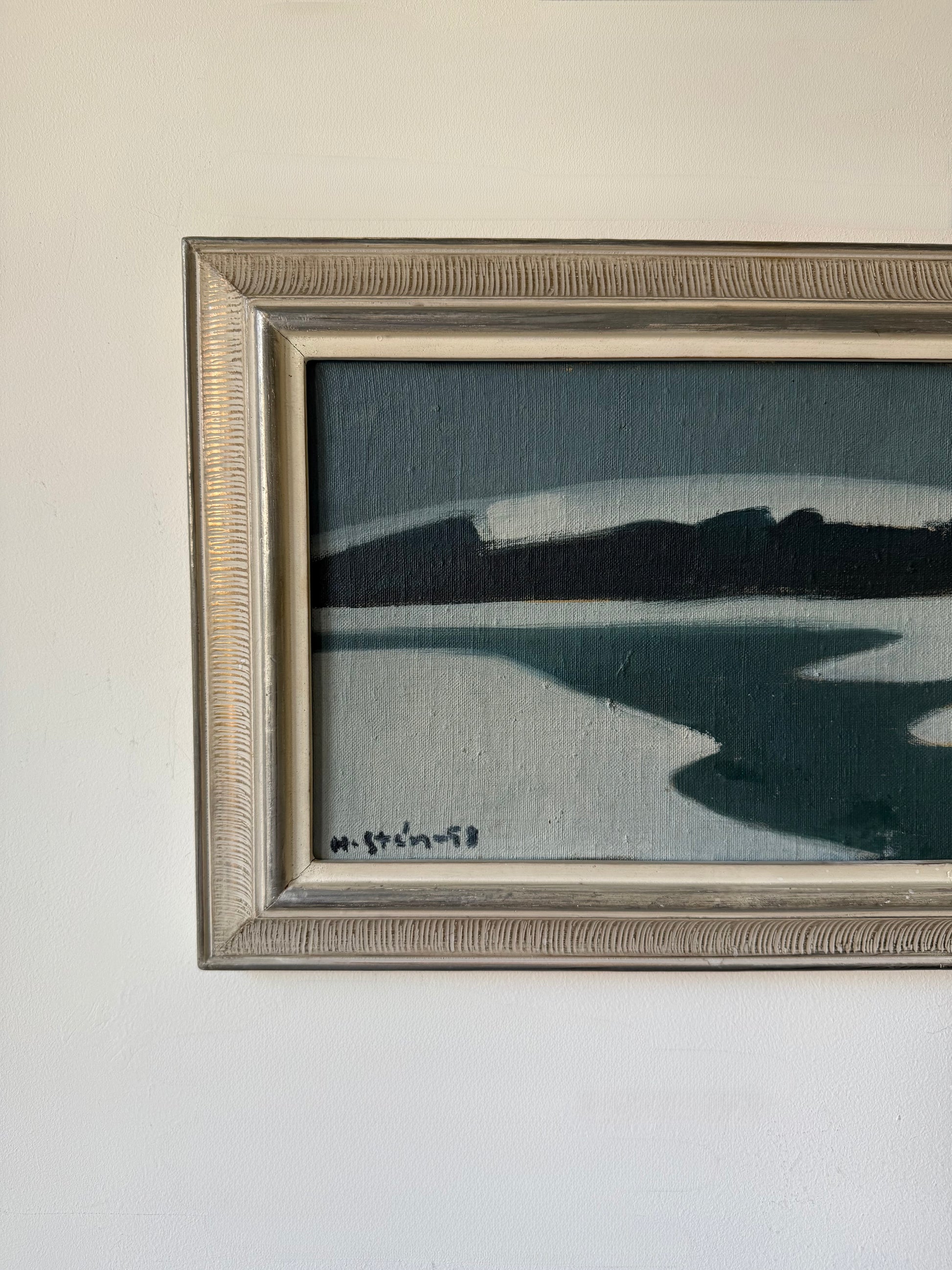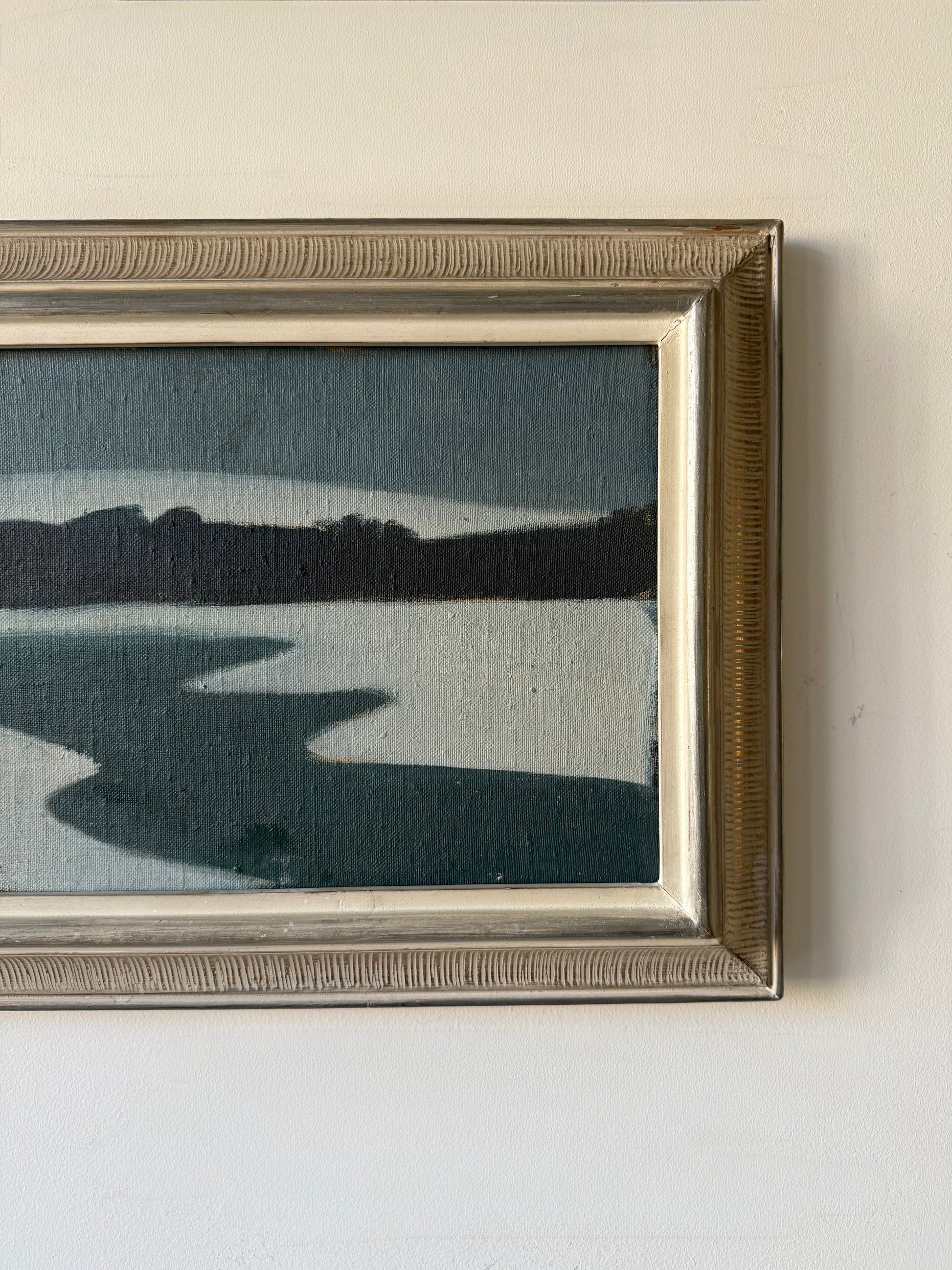 Beautiful river scape of a snowy scene with the mountains and blue sky.