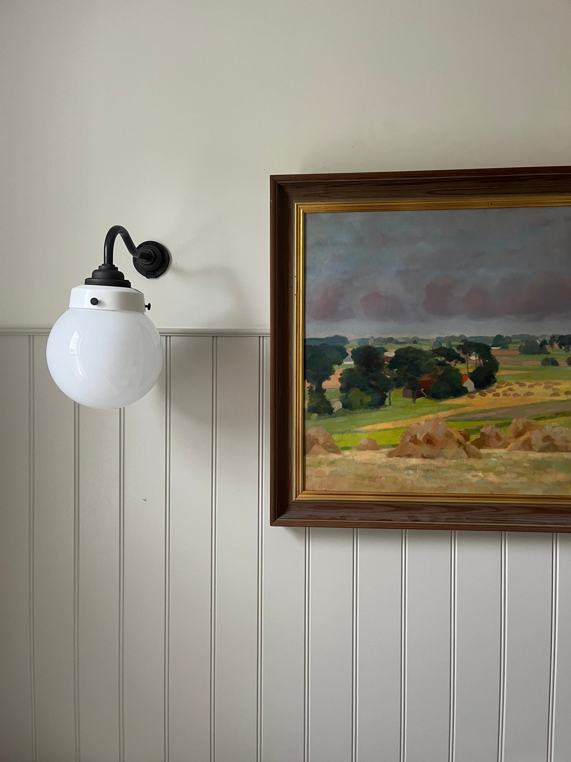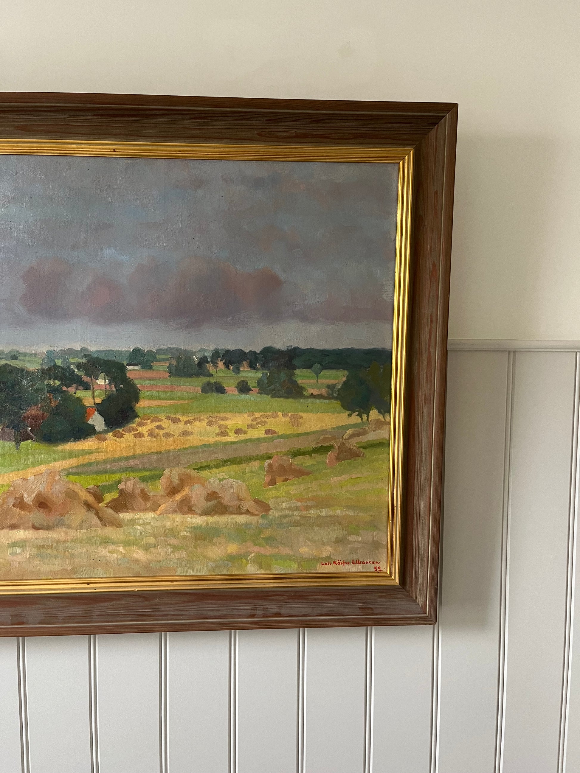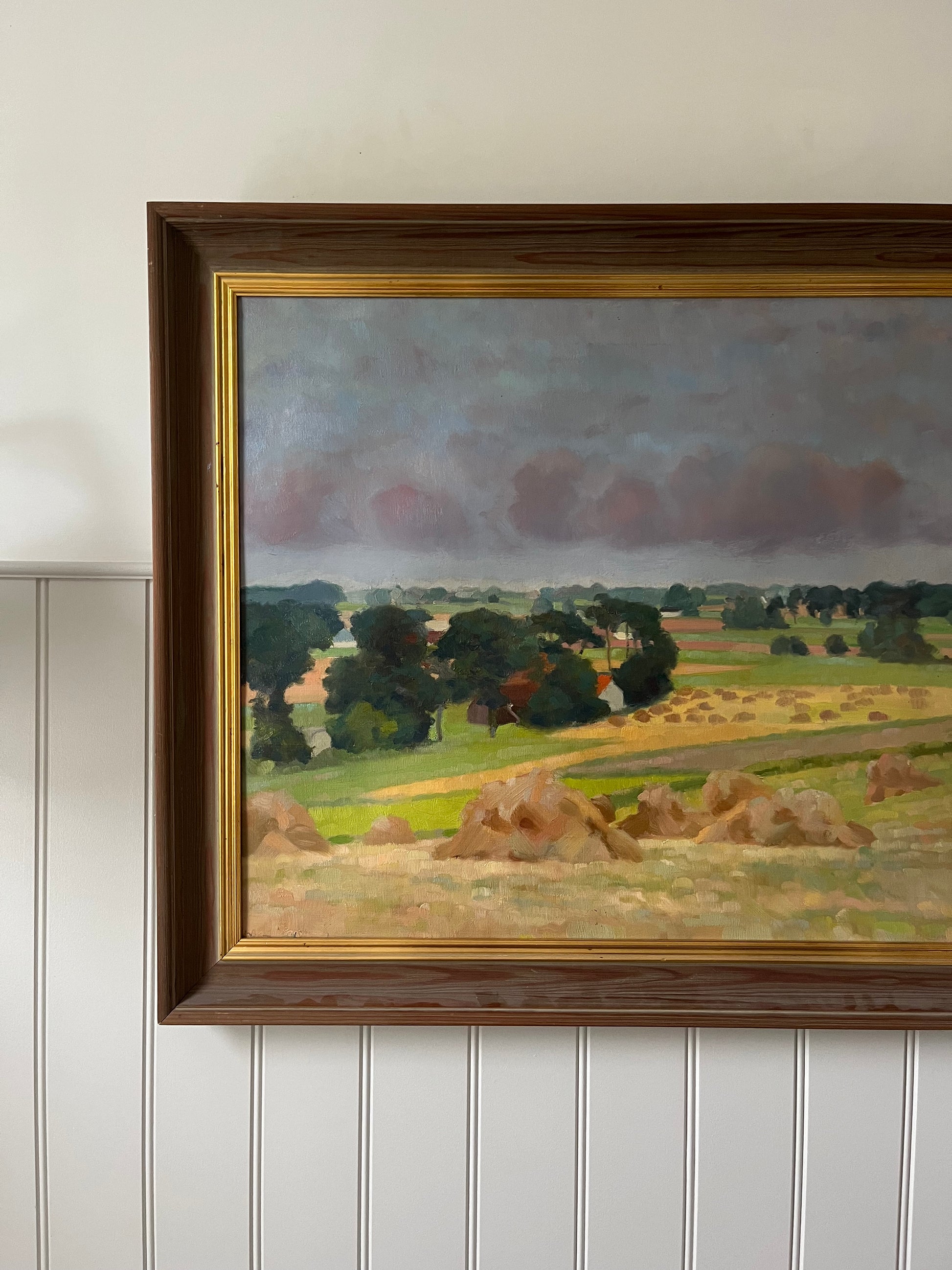 Beautiful fields full of golden hay. Lovely large piece 70 x 86cm. Oil on canvas, dated 1952.