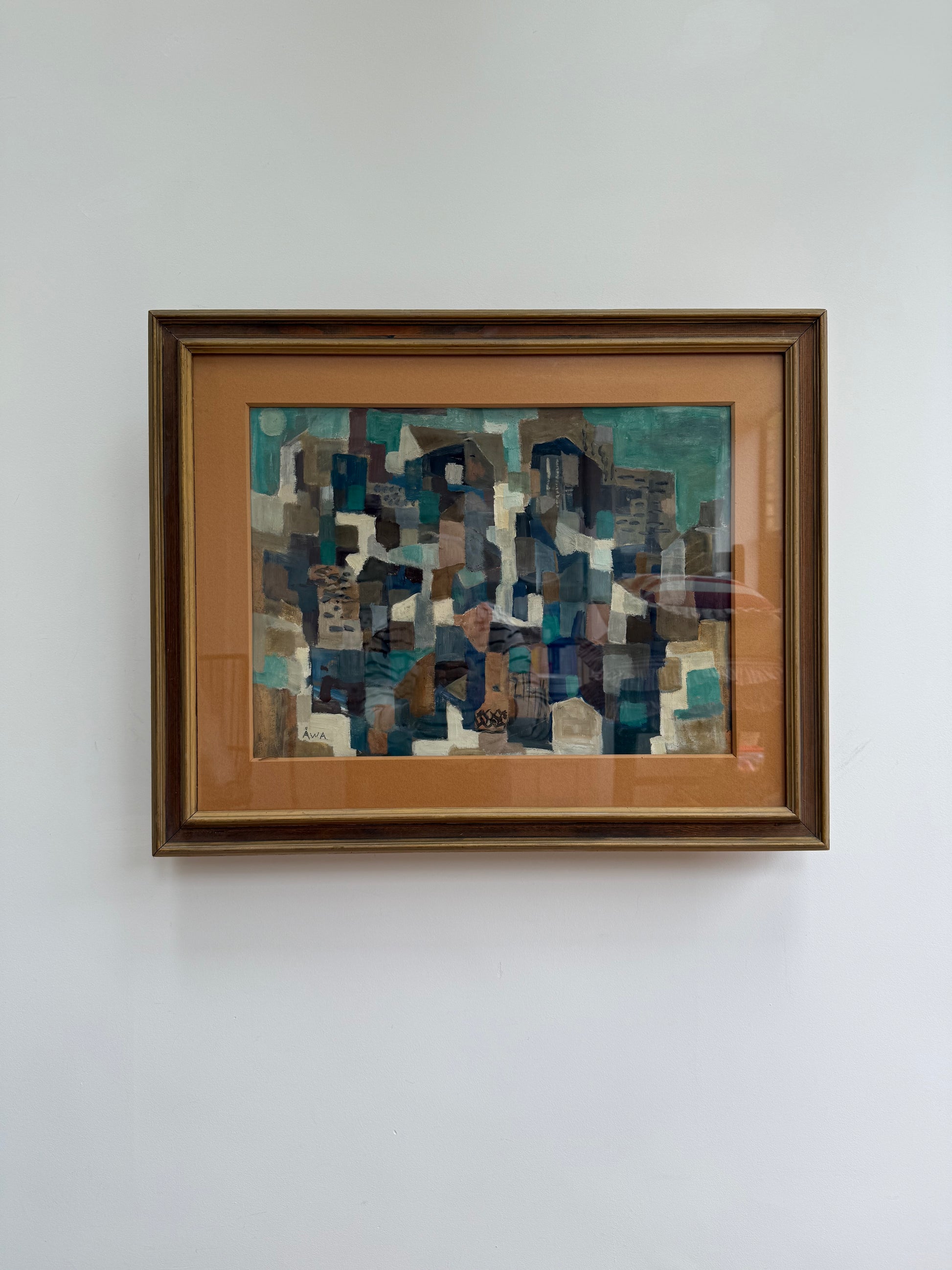 Beautiful abstract hilltop houses. Amazing oil on board behind a glazed frame. Gorgeous browns and blues.