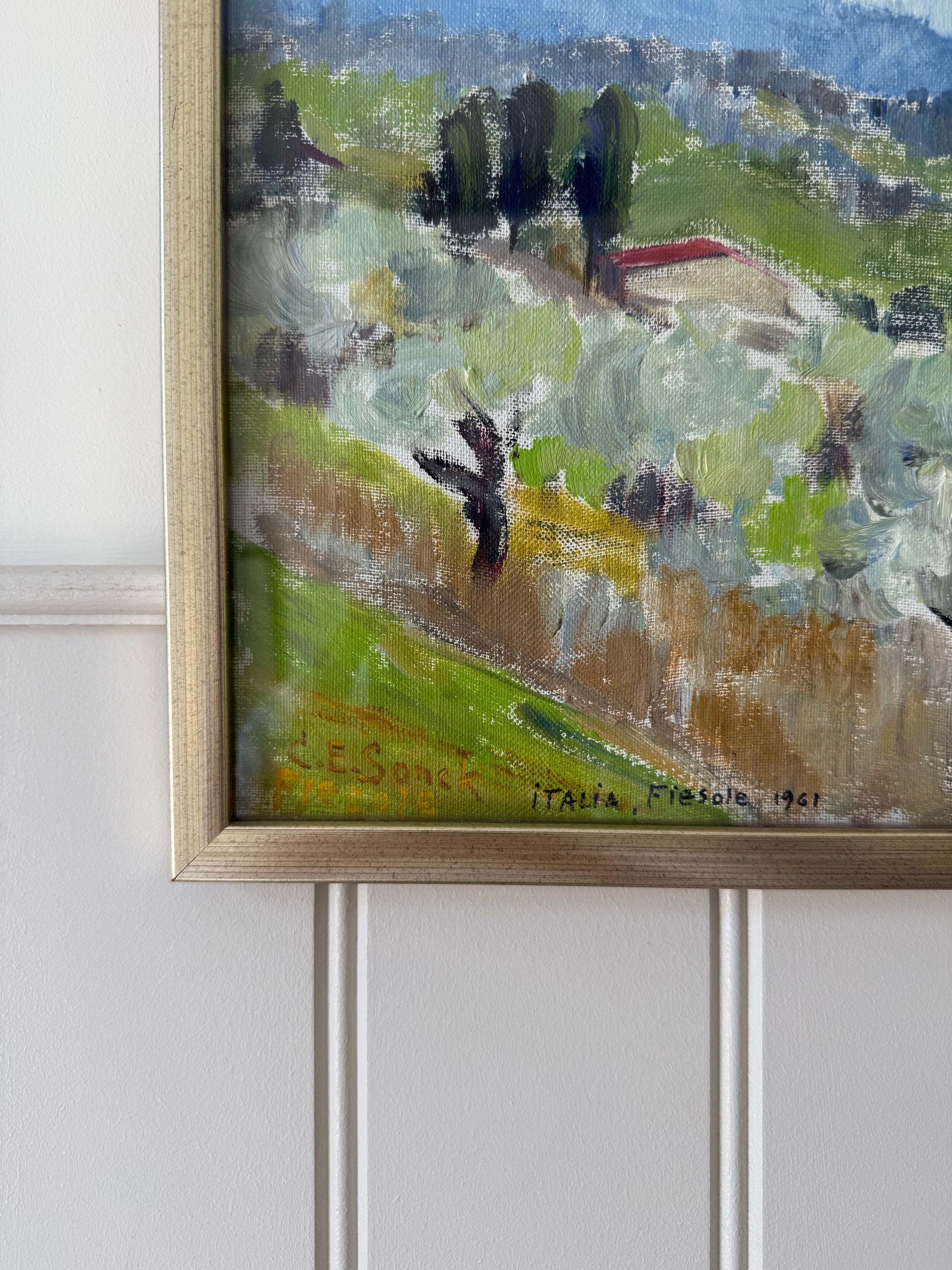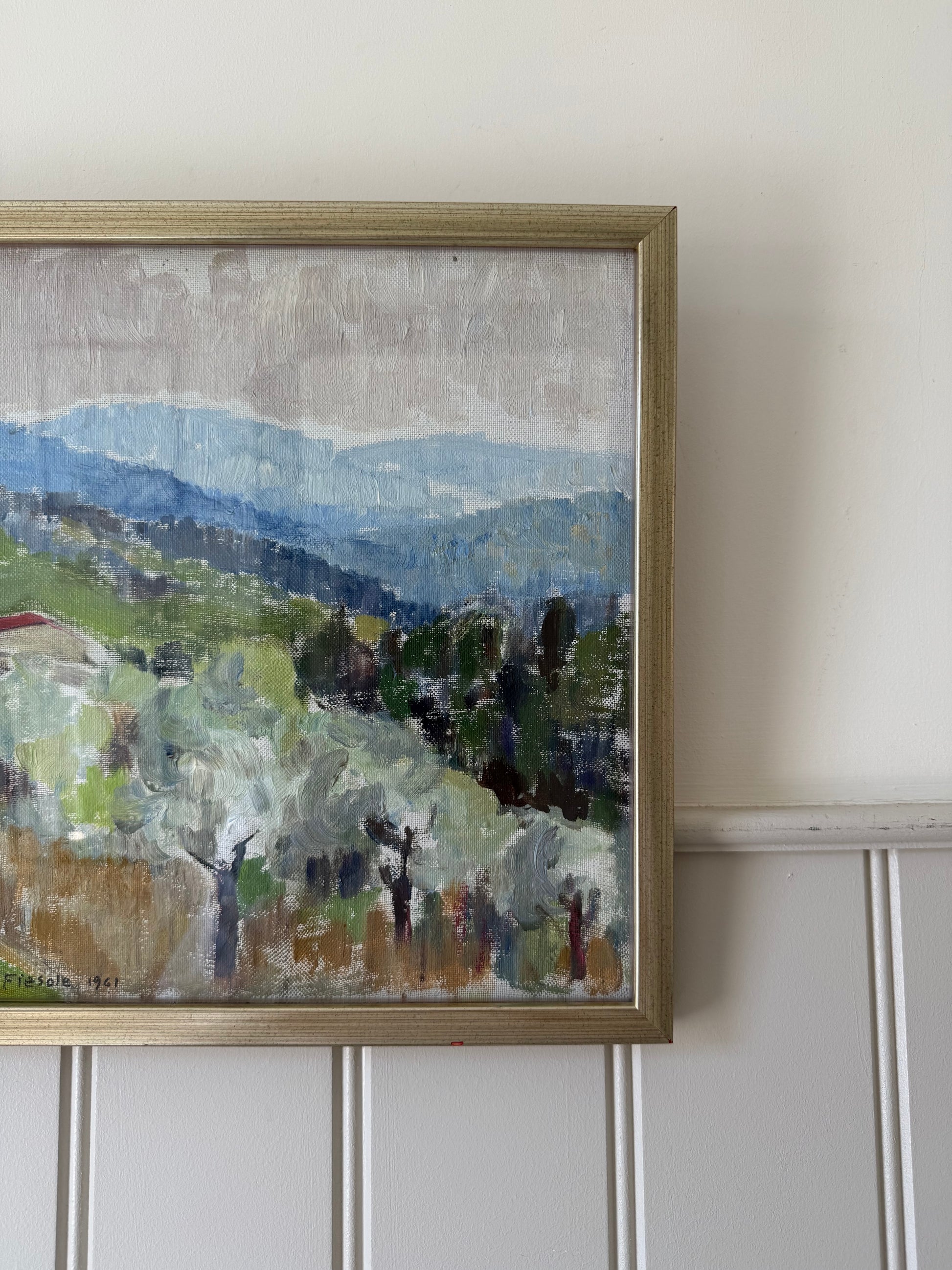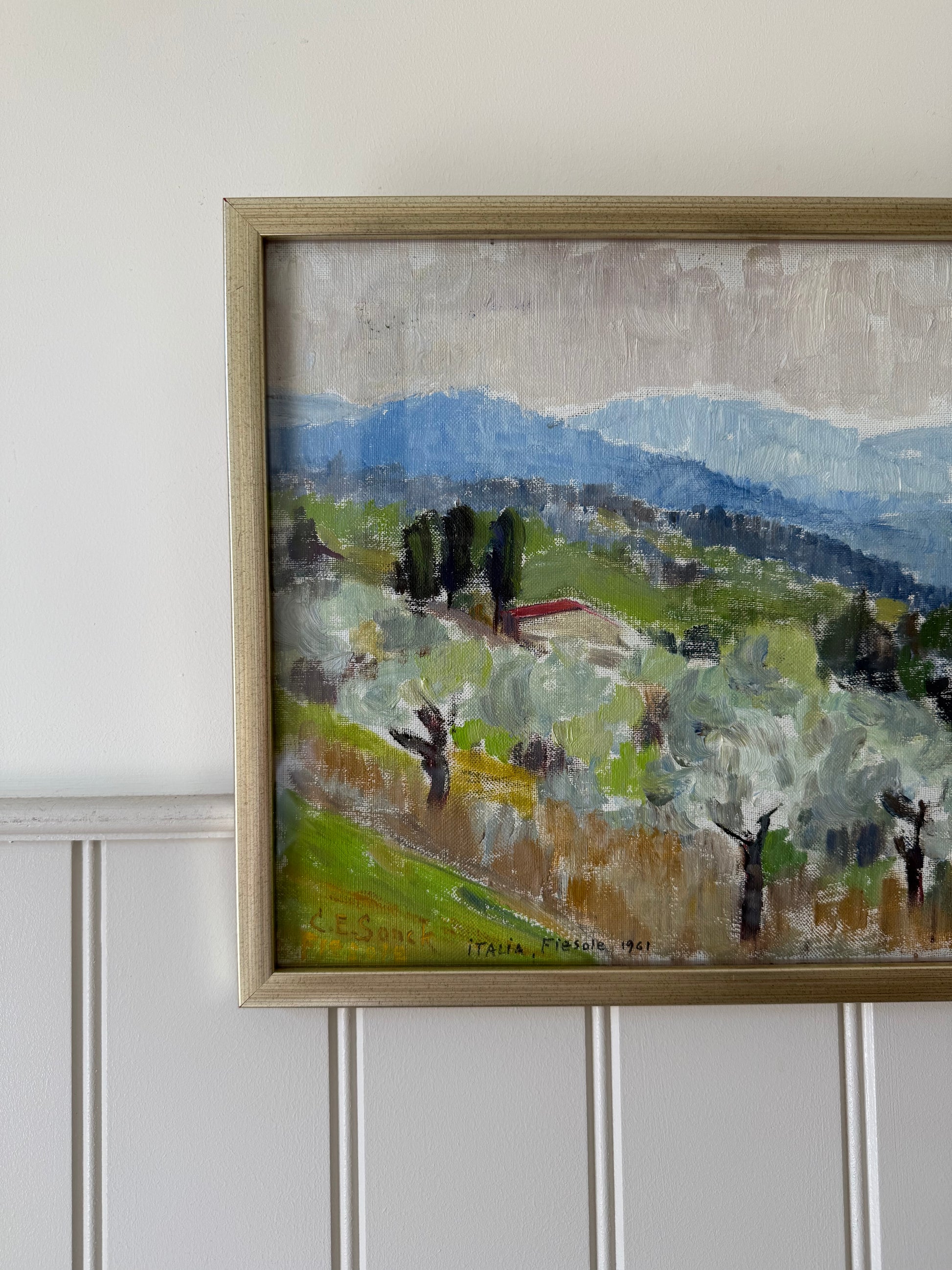 Pretty landscape in the hills with lovely little red house. Sits in a lovely simple glazed frame.