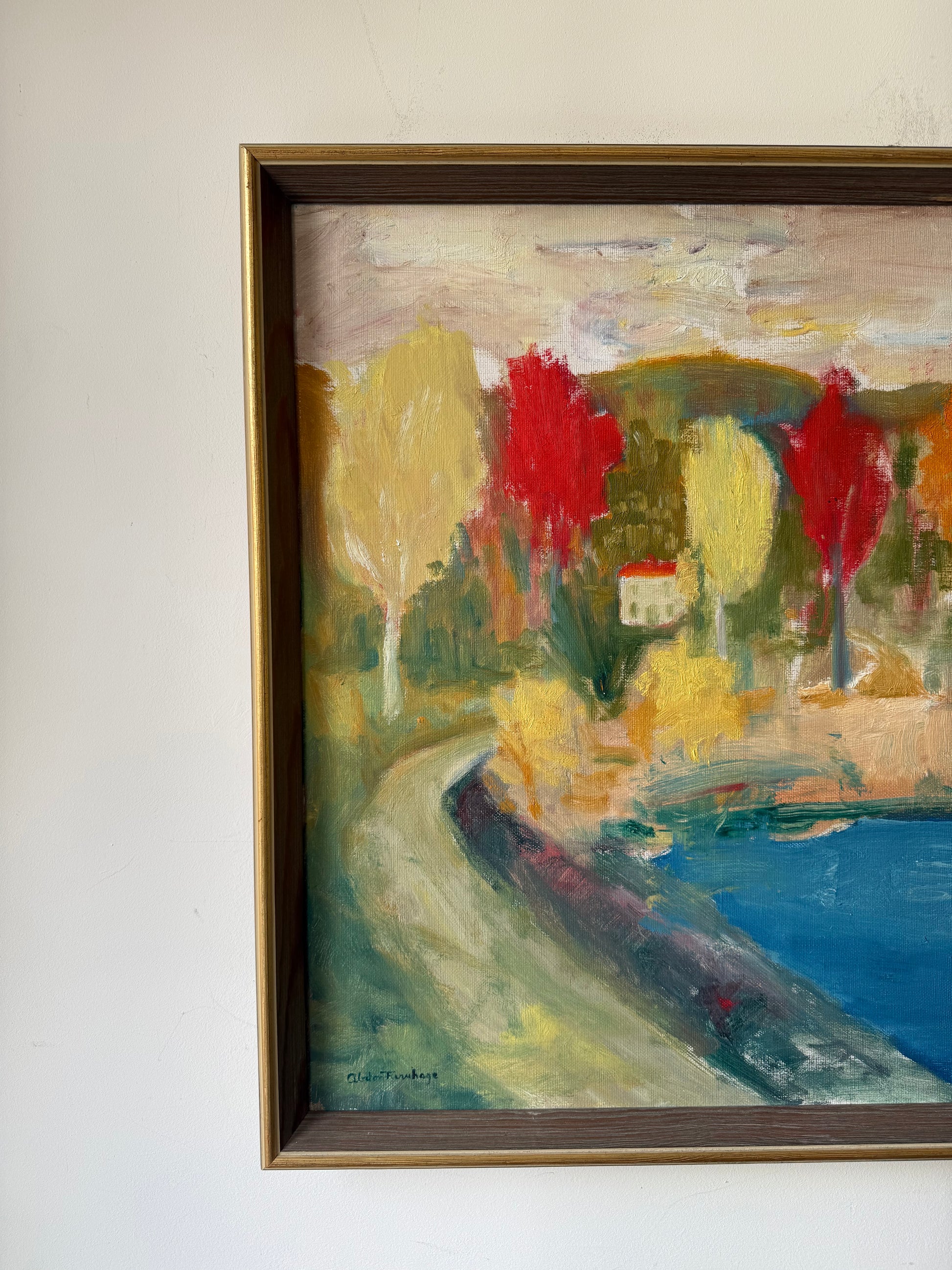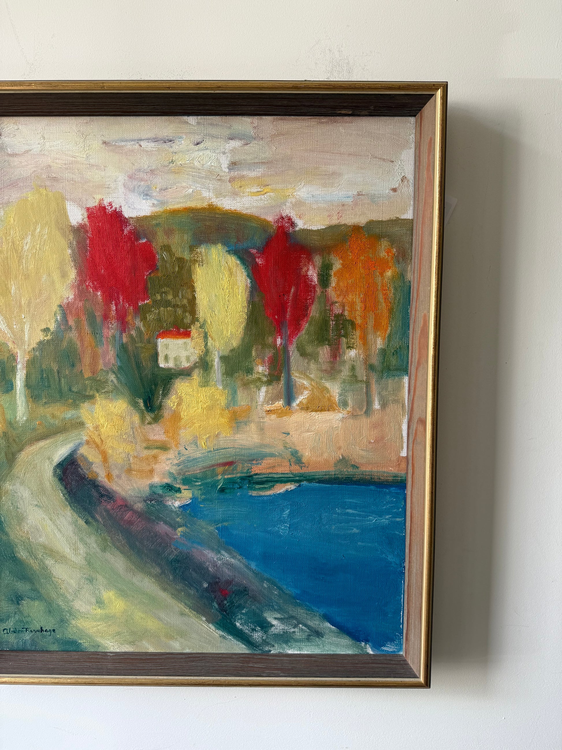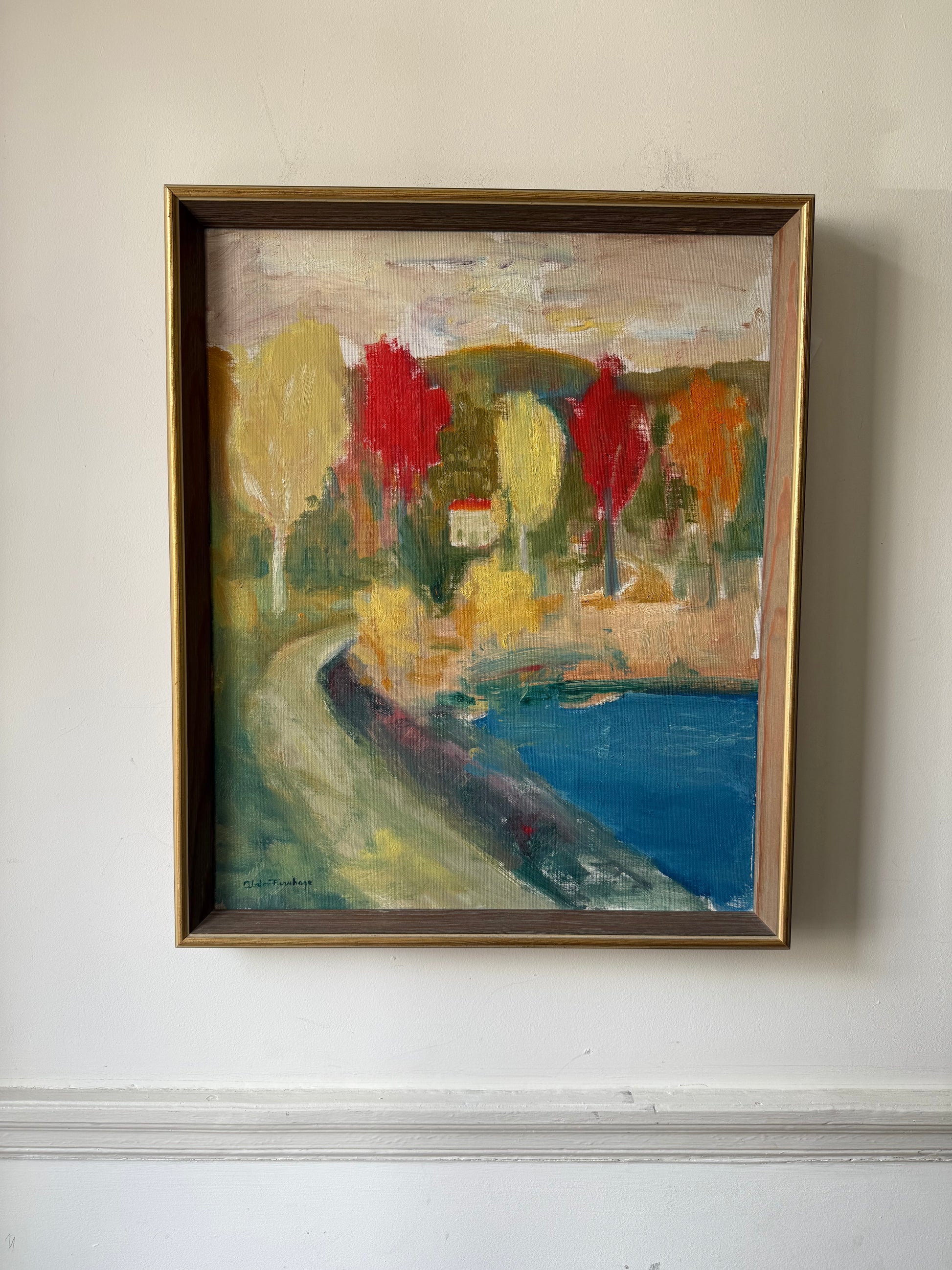 Beautiful oil on canvas with an excellent little red house in the trees. Forever loving a pop of red in artwork.