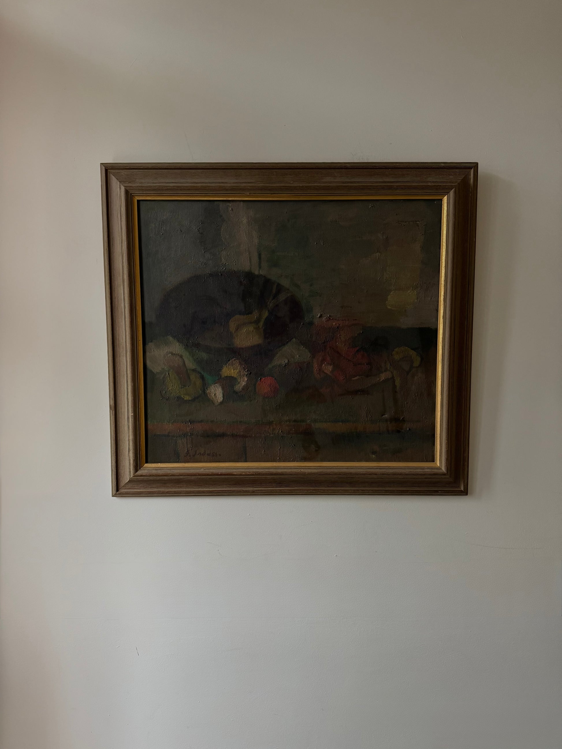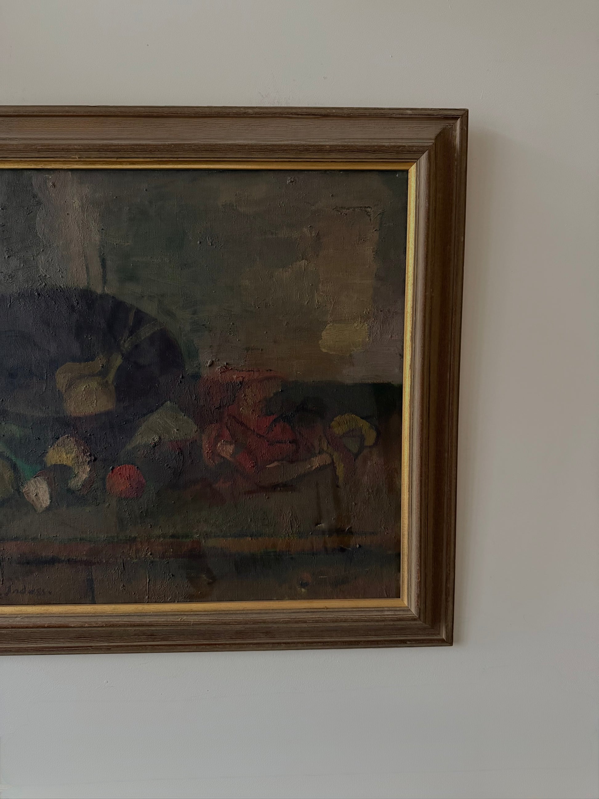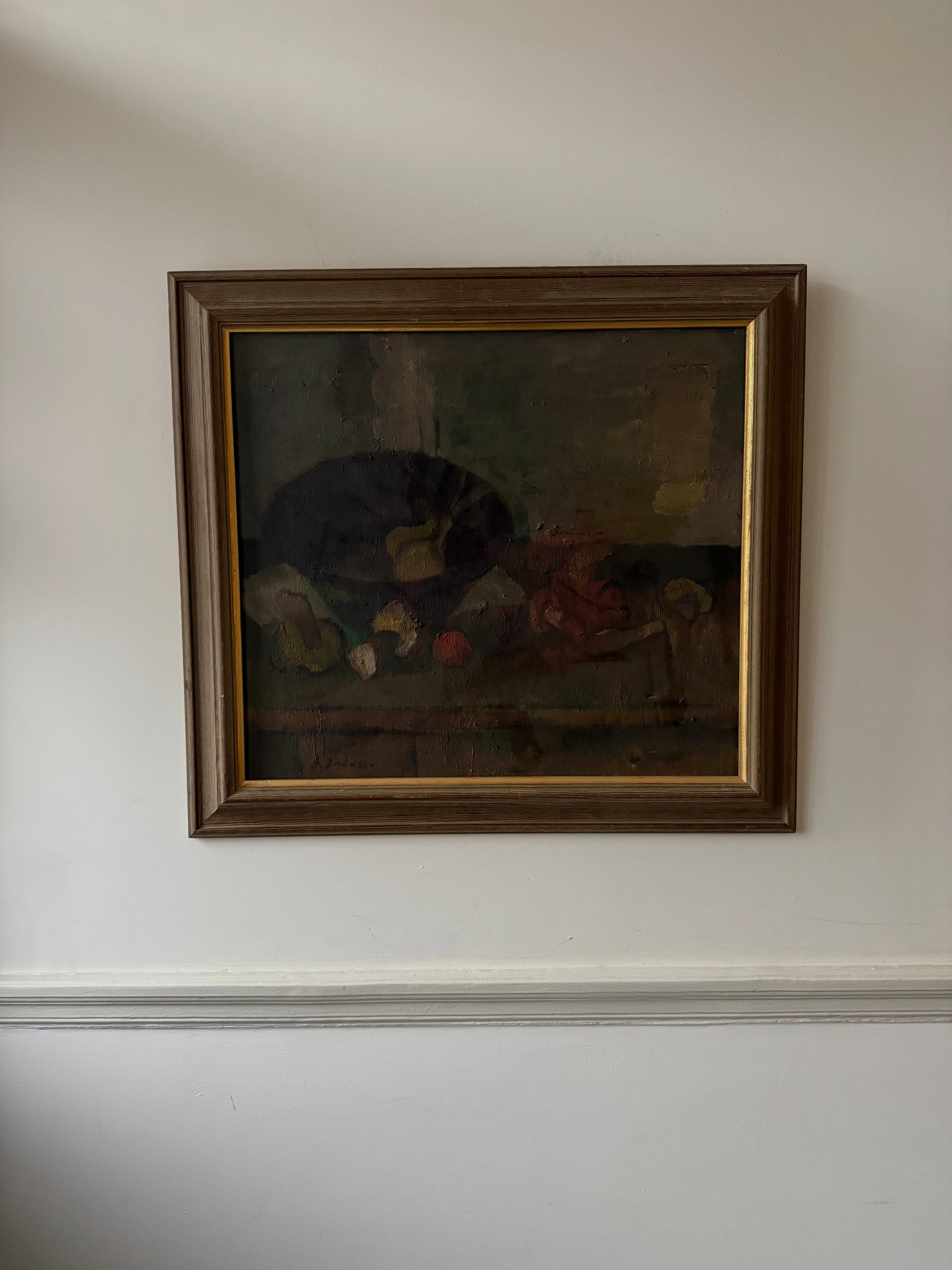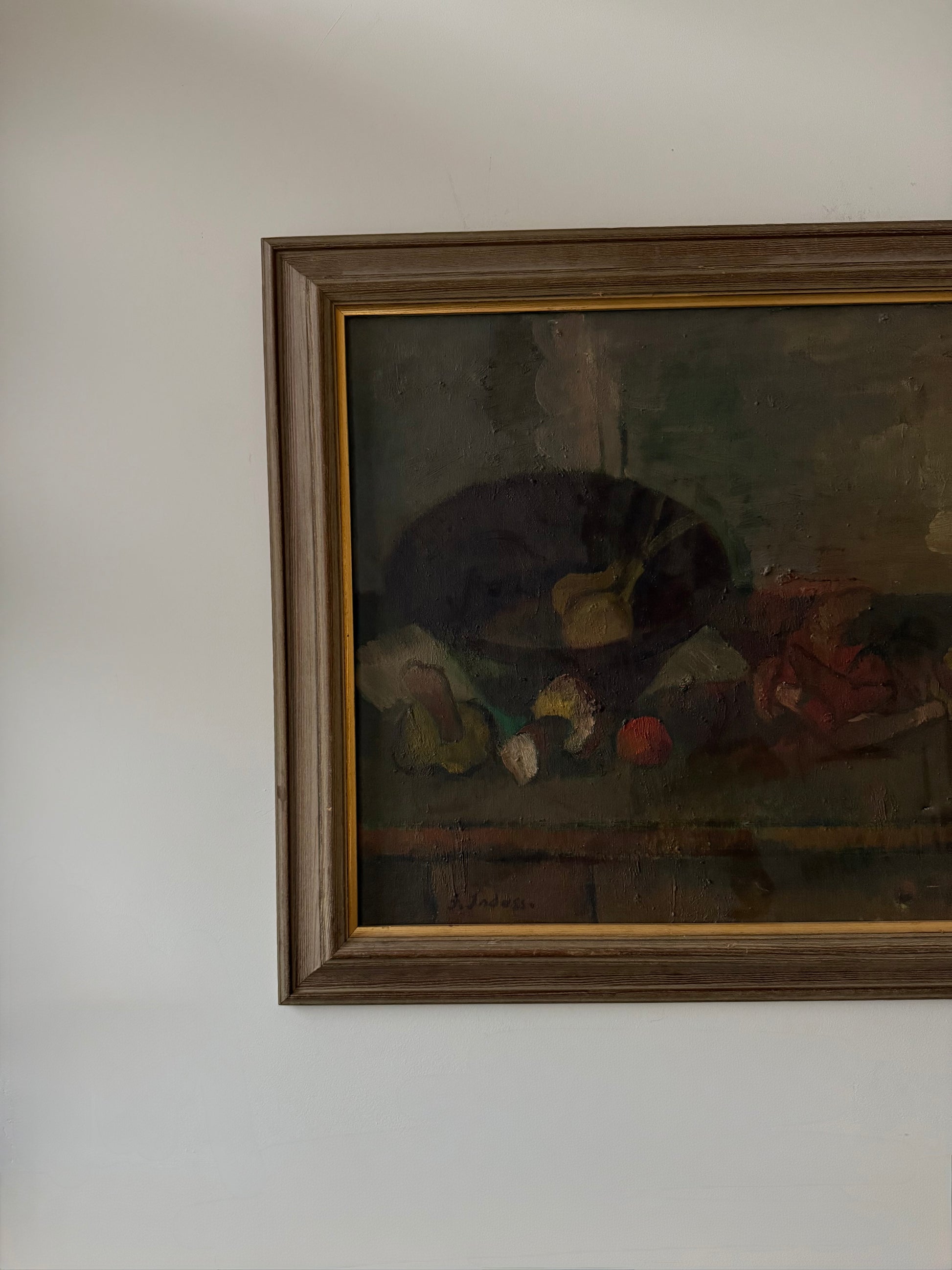 Stunning dark still life featuring some beautiful mushrooms next to a large bowl.