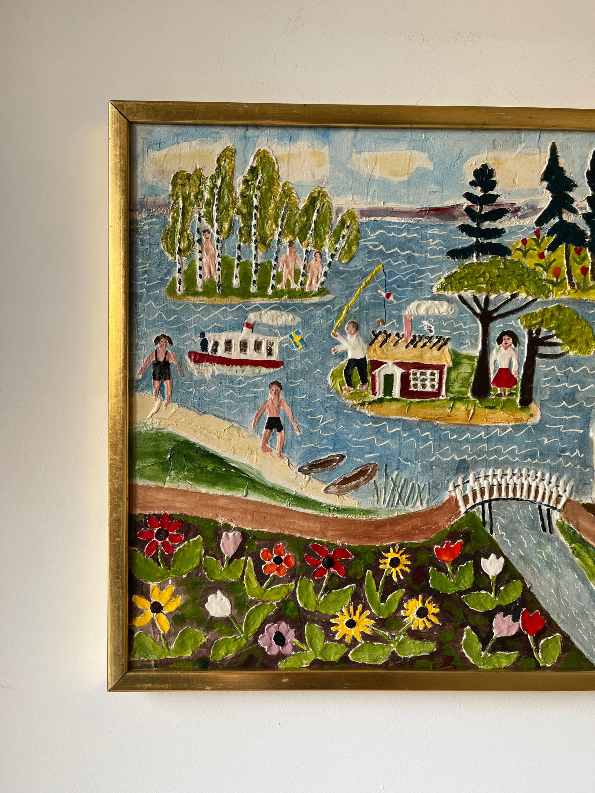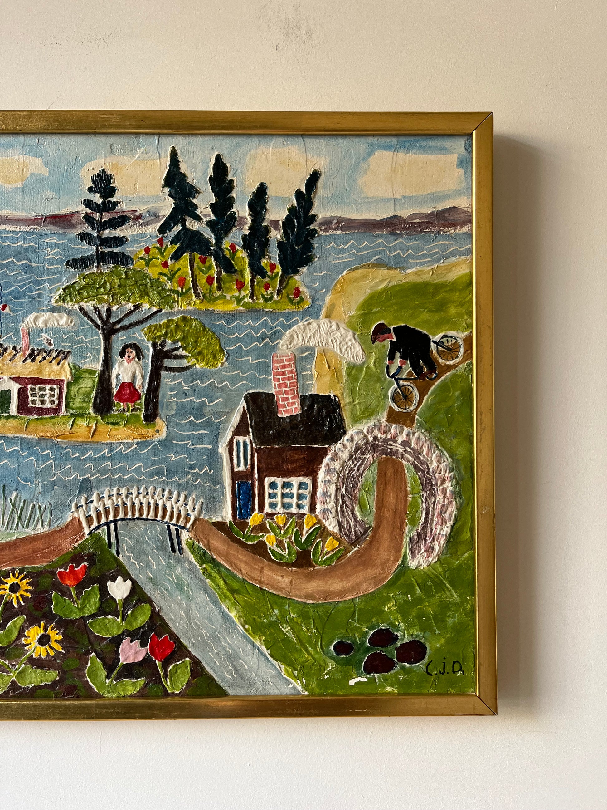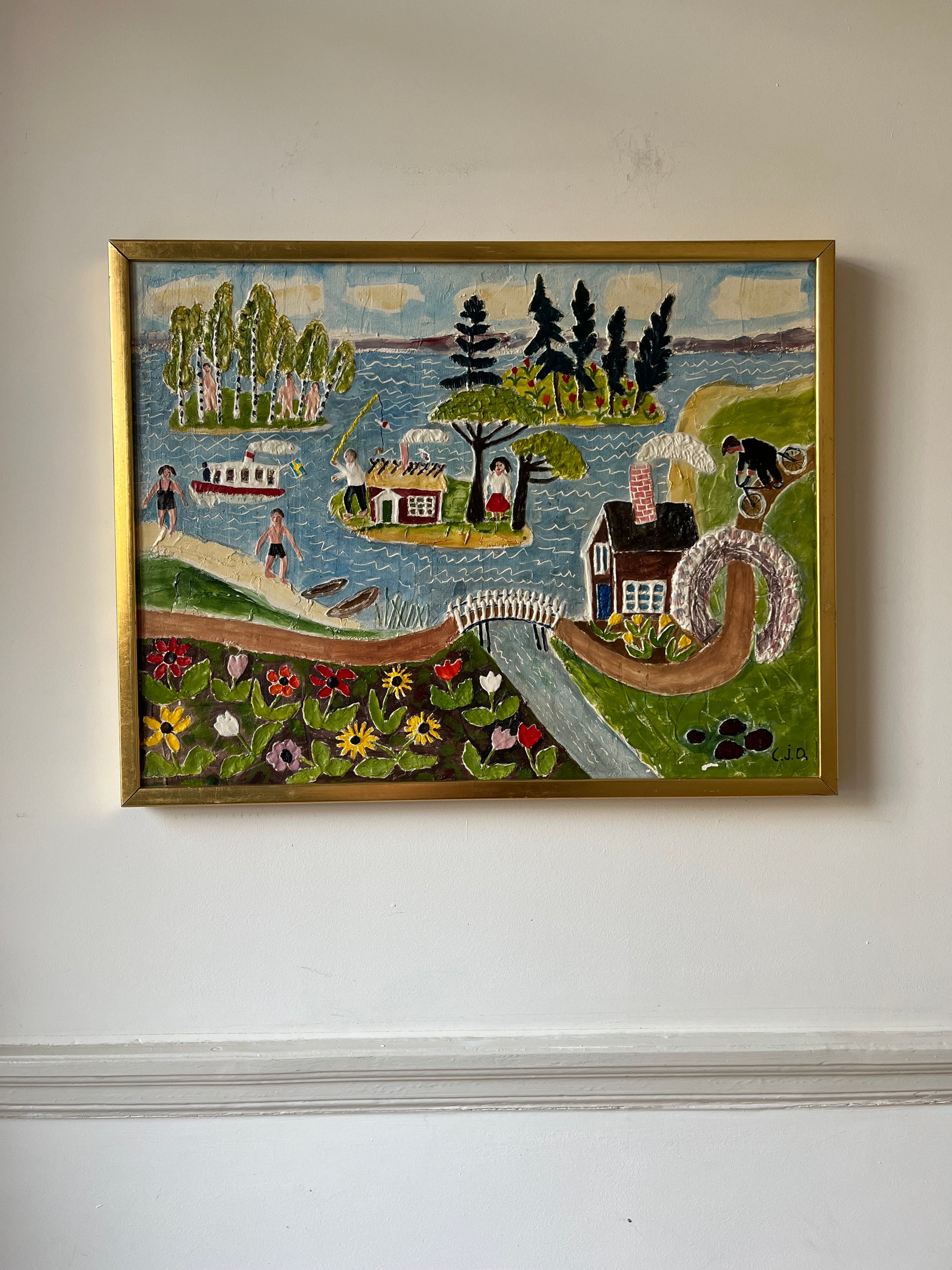The coolest Naive style oil on panel. Amazing primary colours and coolest little characters!