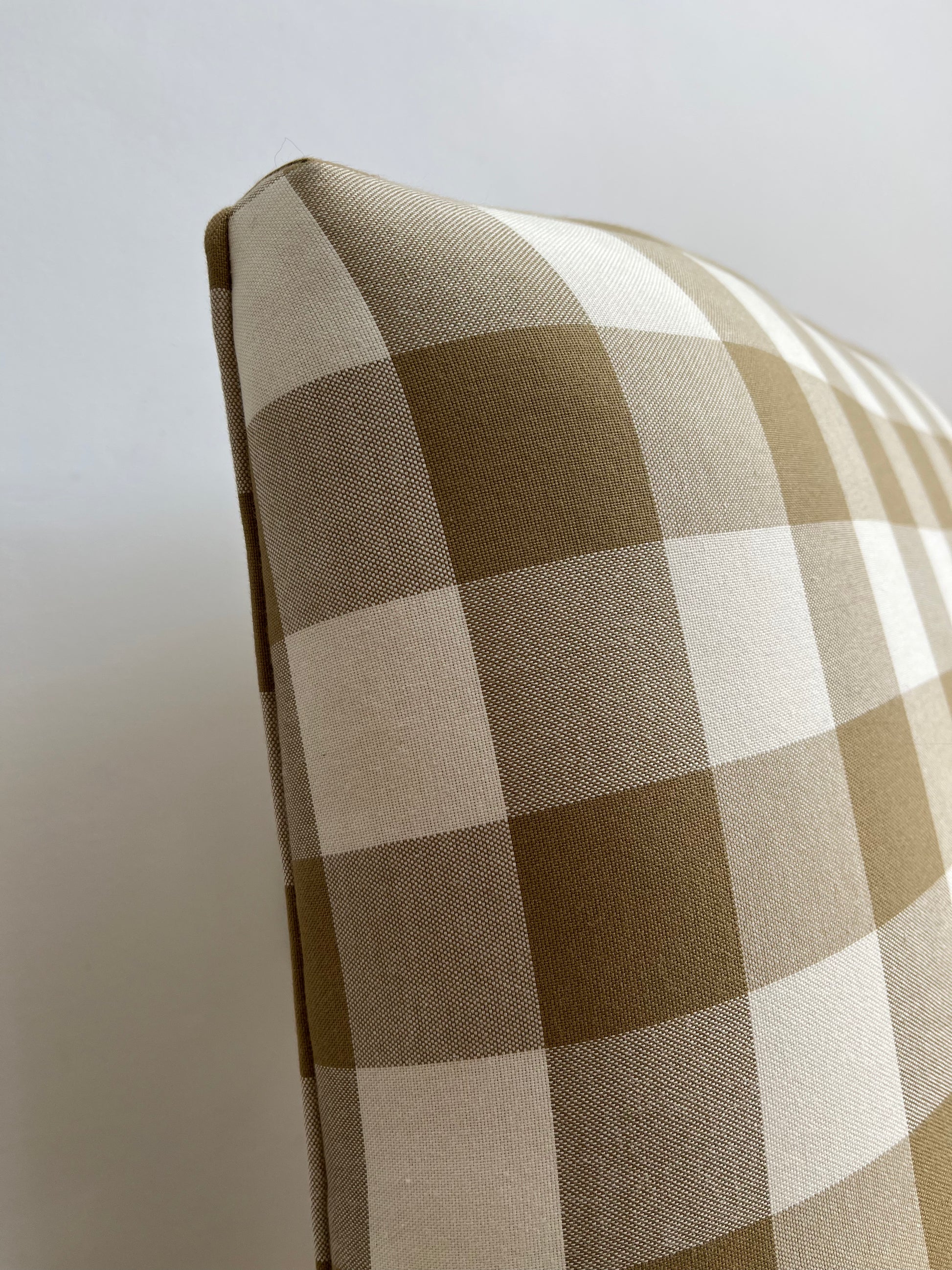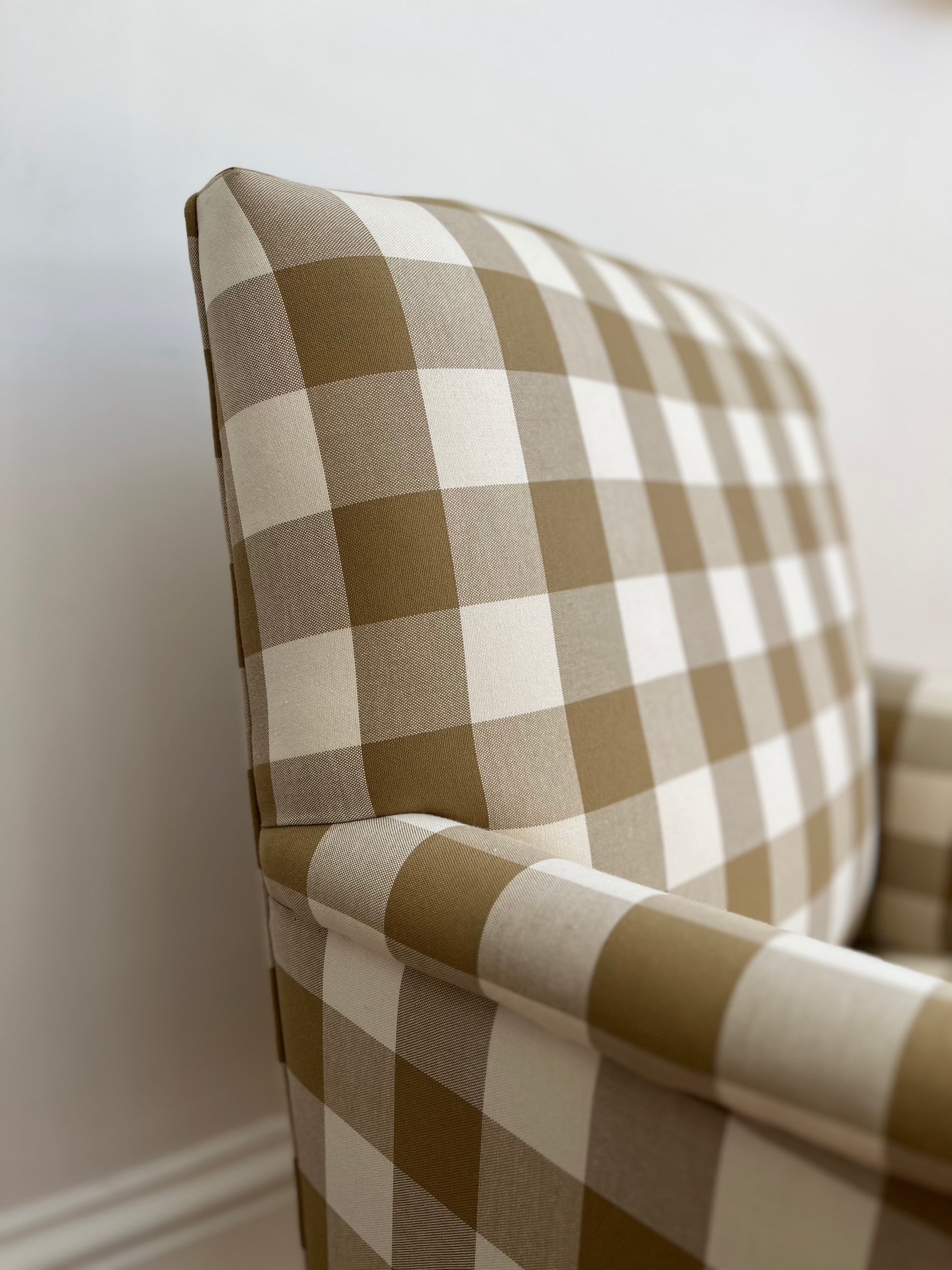 Stunning pair of antique armchairs newly reupholstered in the most amazing gingham fabric by Gaston e daniela Deia fabric - such a beautiful caramel/toffee colour.