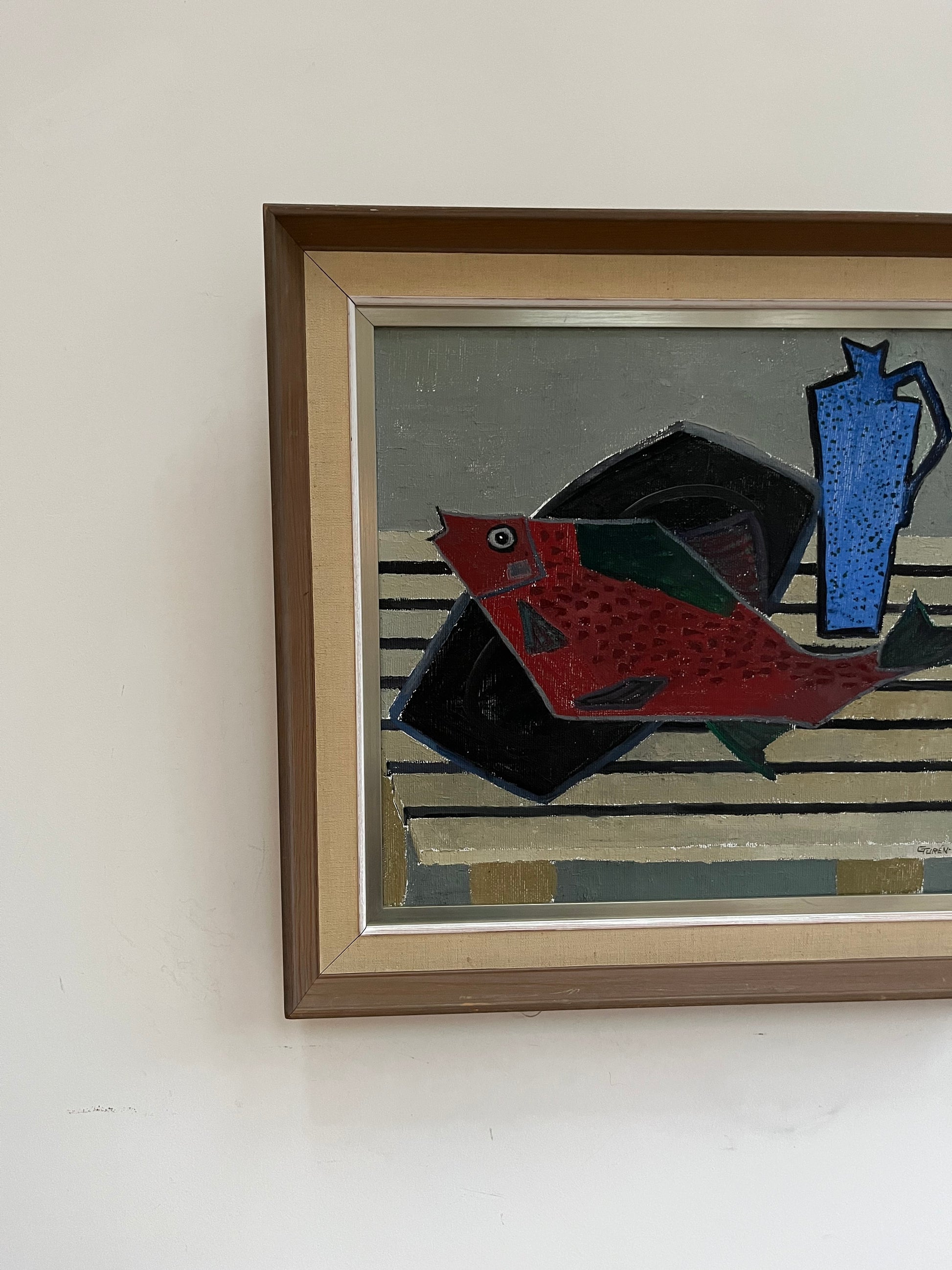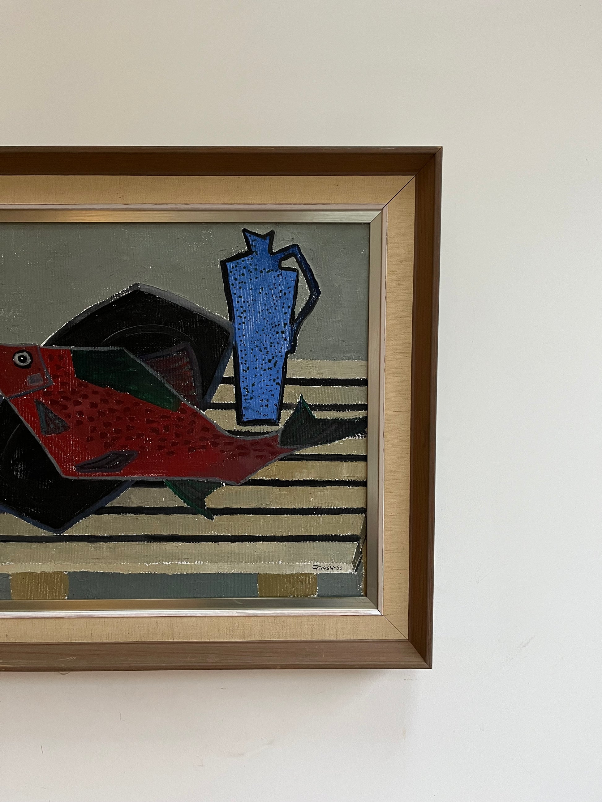 INCREDIBLE oil on canvas of a beautiful red fish and blue jug.