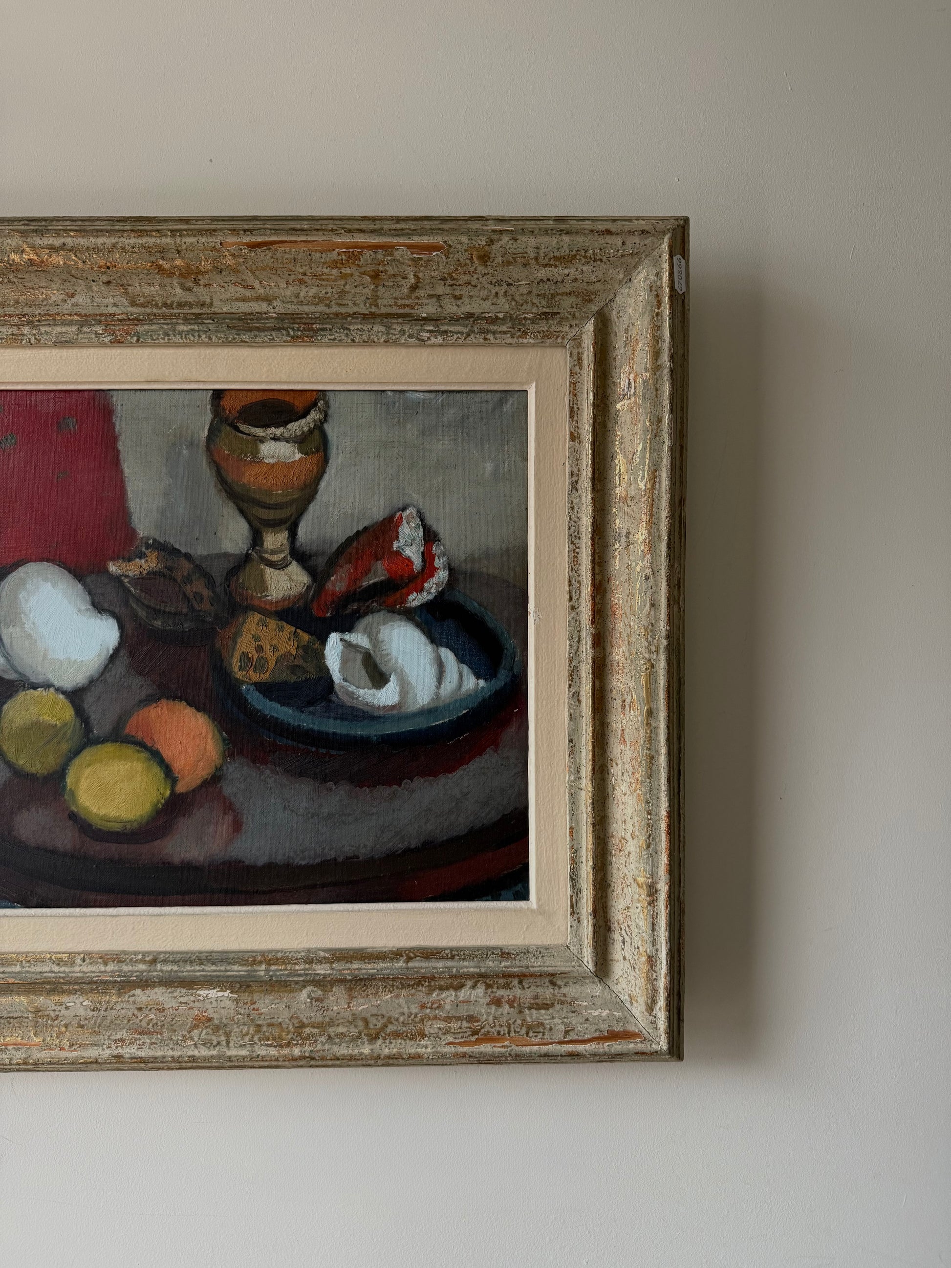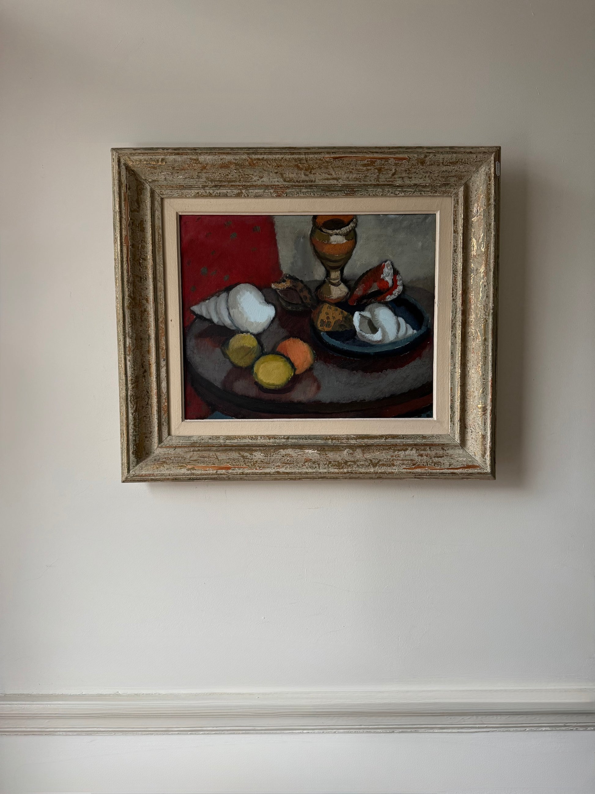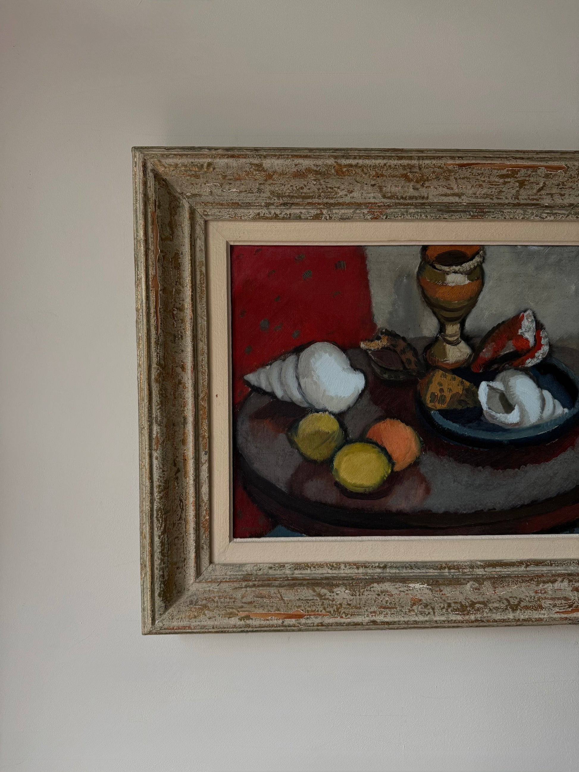 Stunning shell still life with the most beautiful pop of red. Incredible frame too. Magical piece.