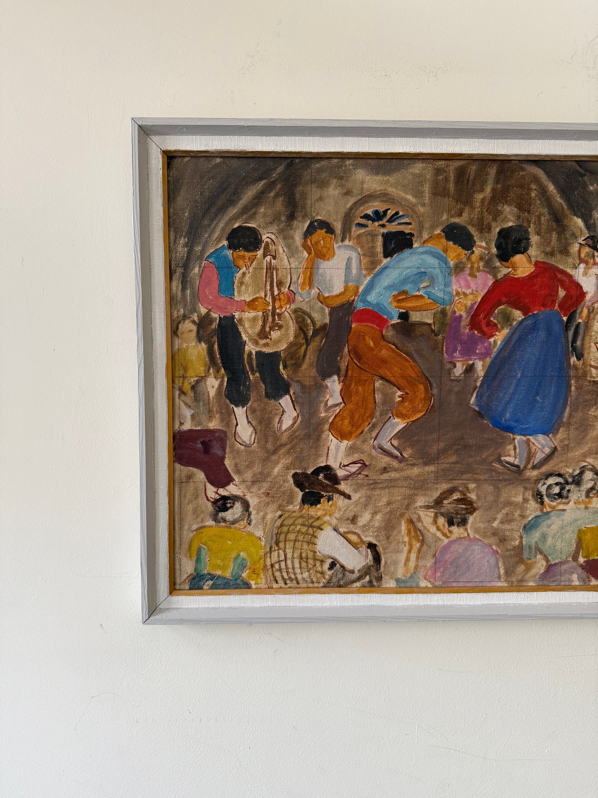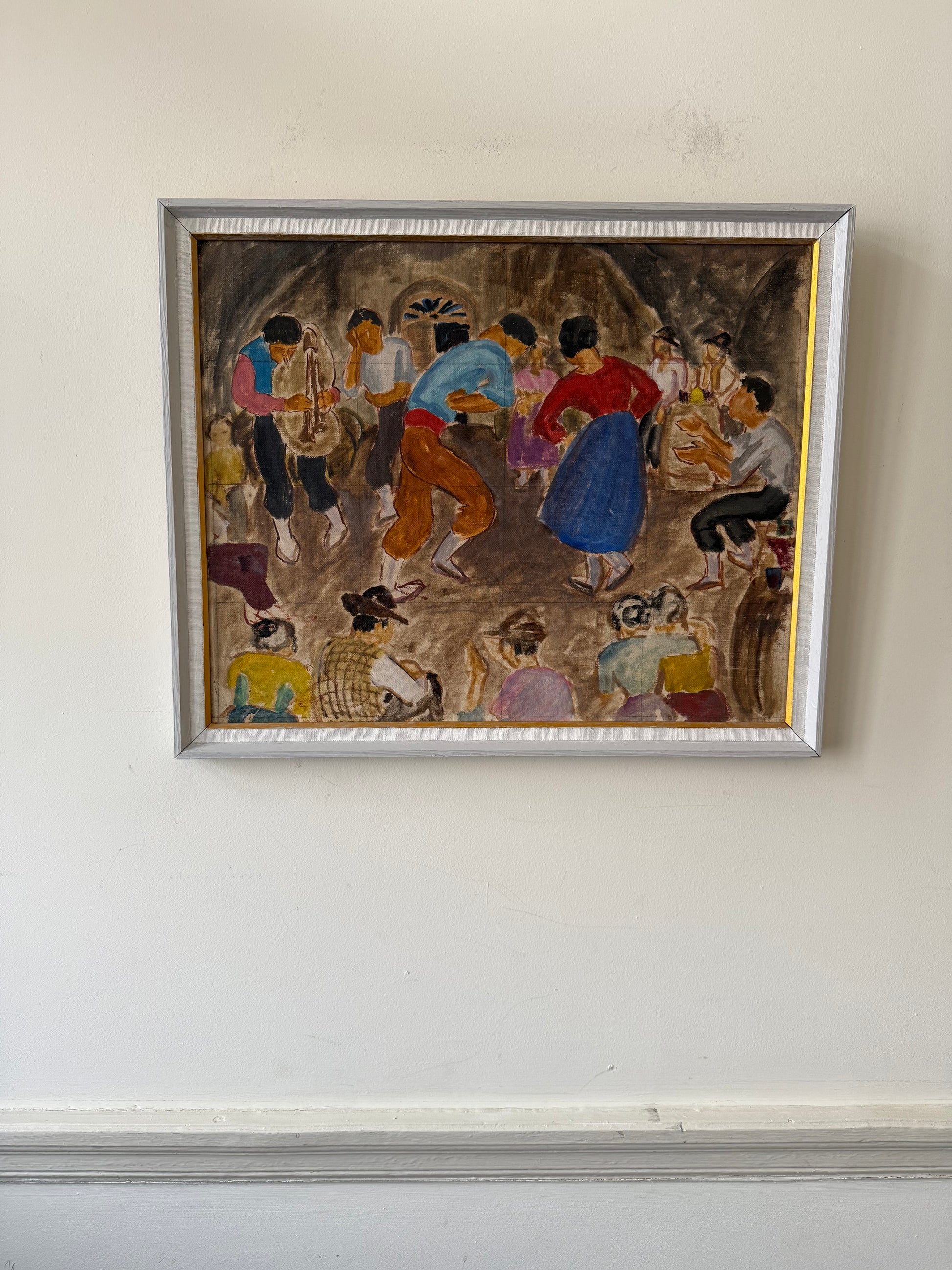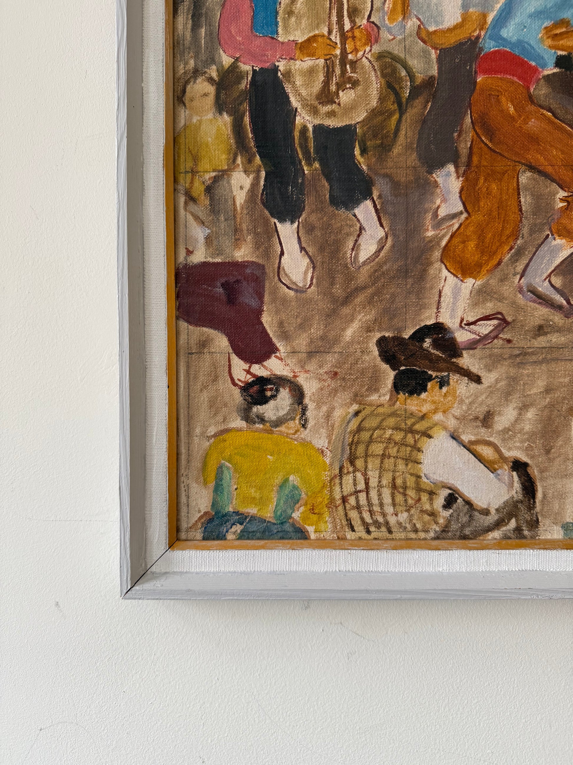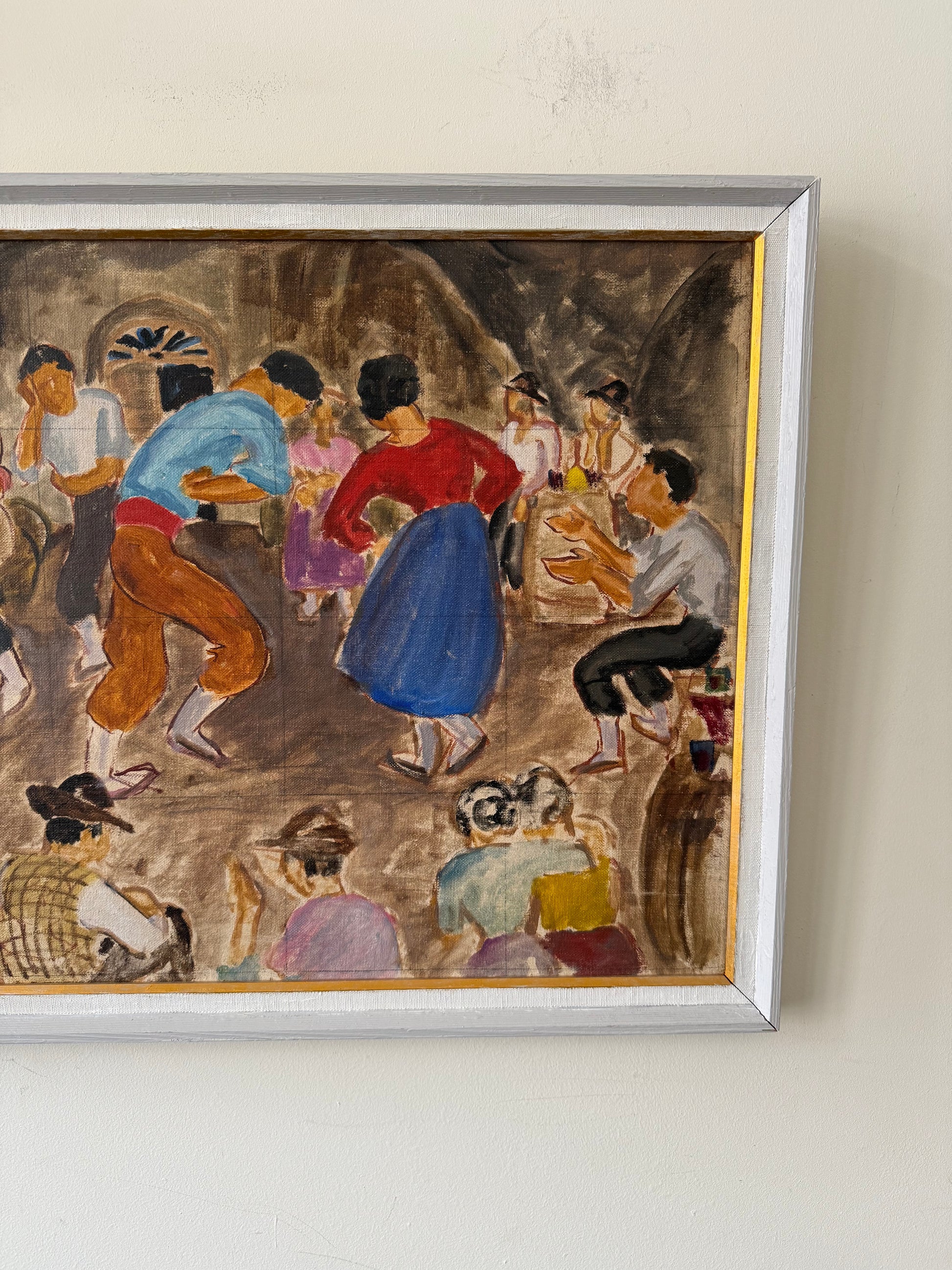 Super cool oil on canvas laid on panel. With simple art frame. Love the colours and patterns in this - such a fun scene!