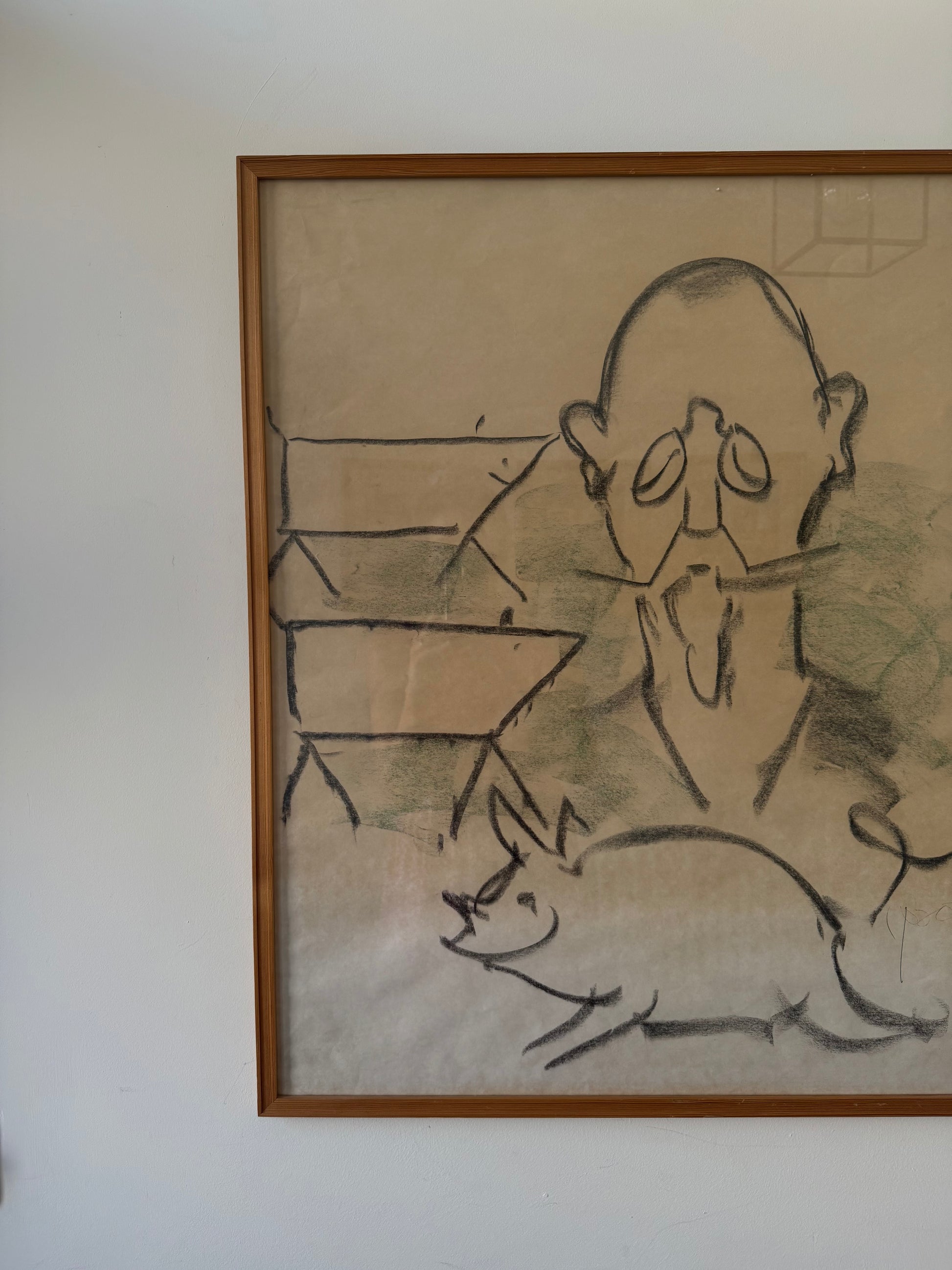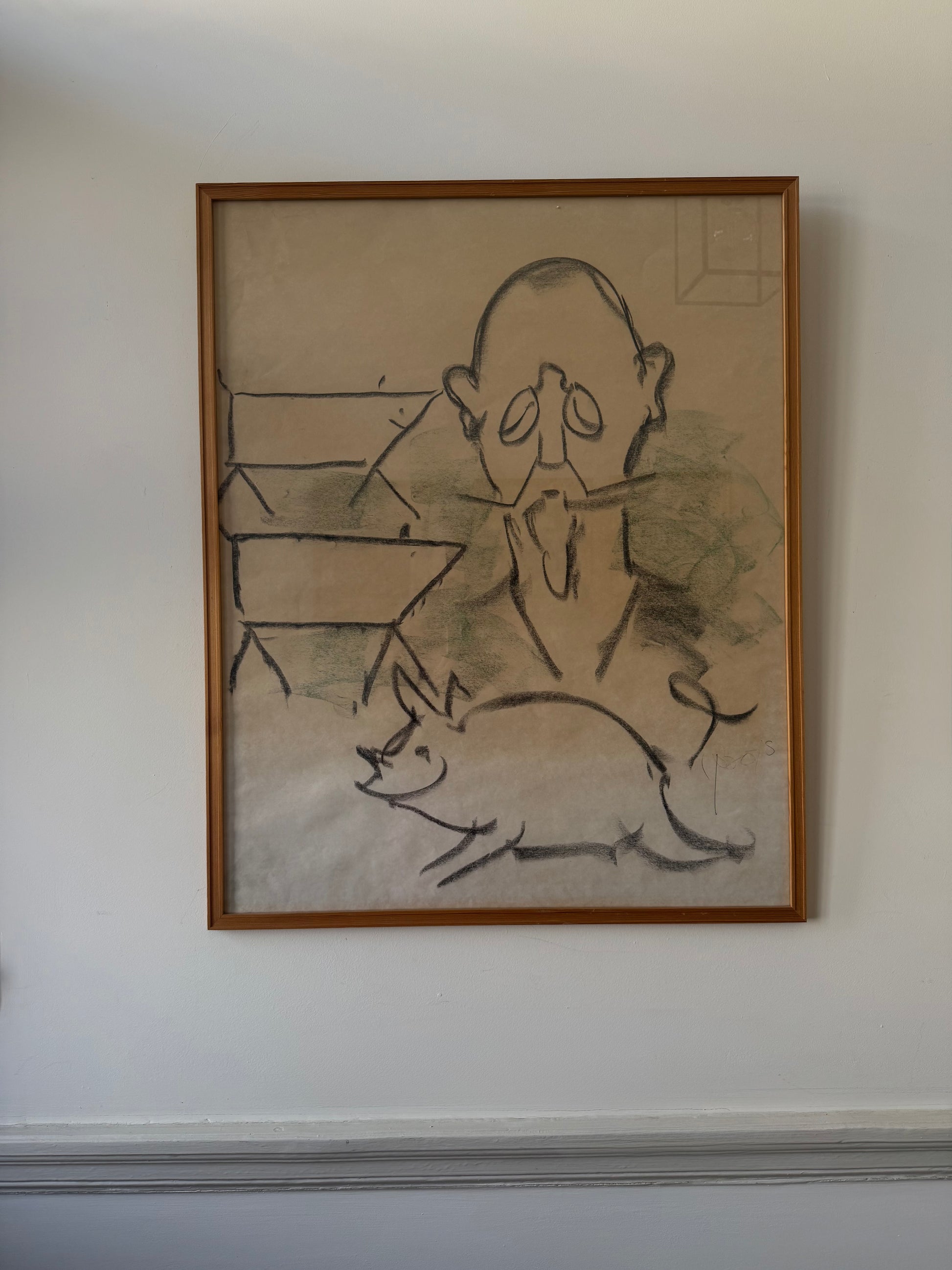 62 x 77cm. Glazed frame. Pencil or charcoal drawing. Signed.