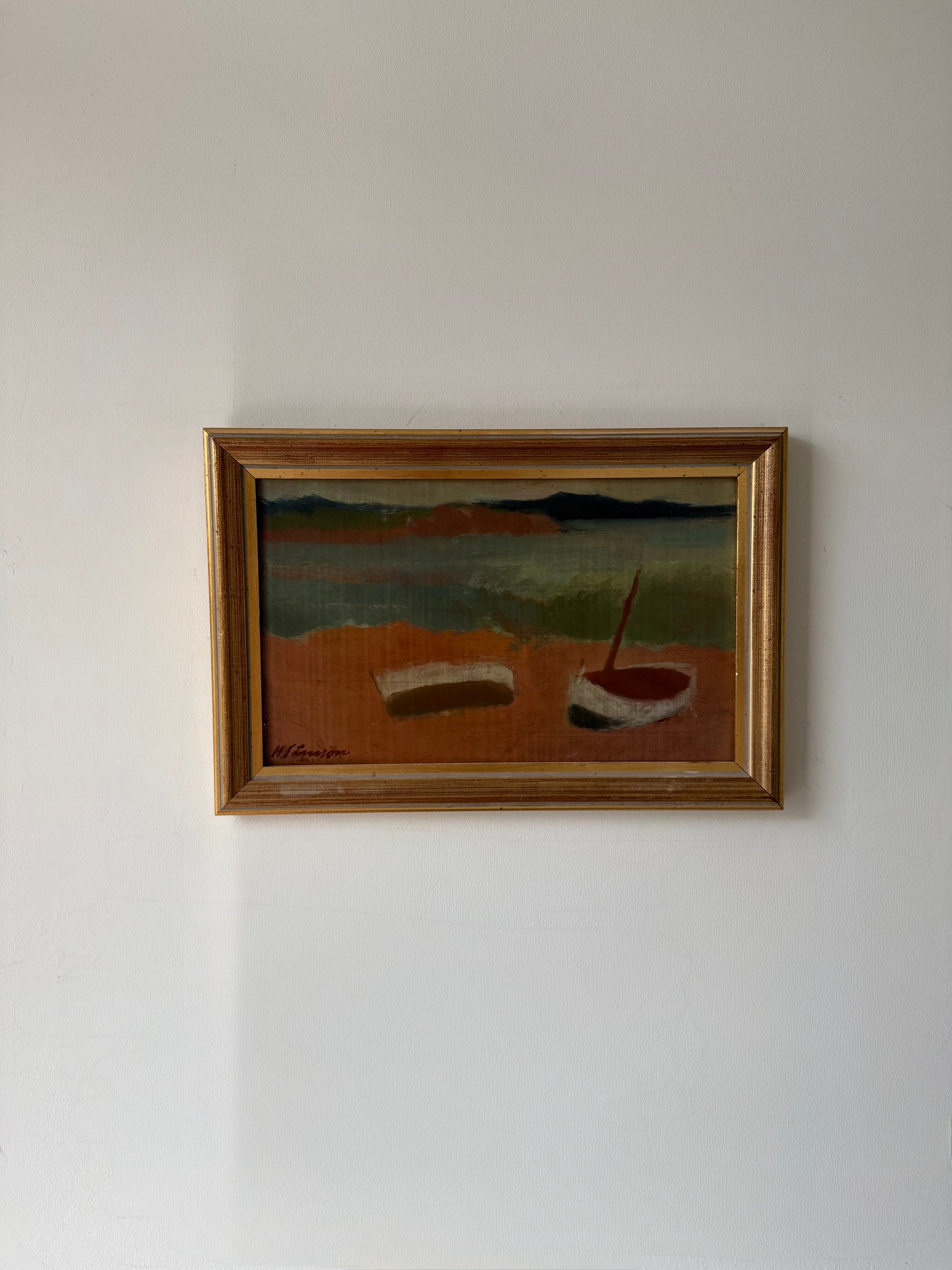 Absolutely beautiful piece of two boats on the shore.