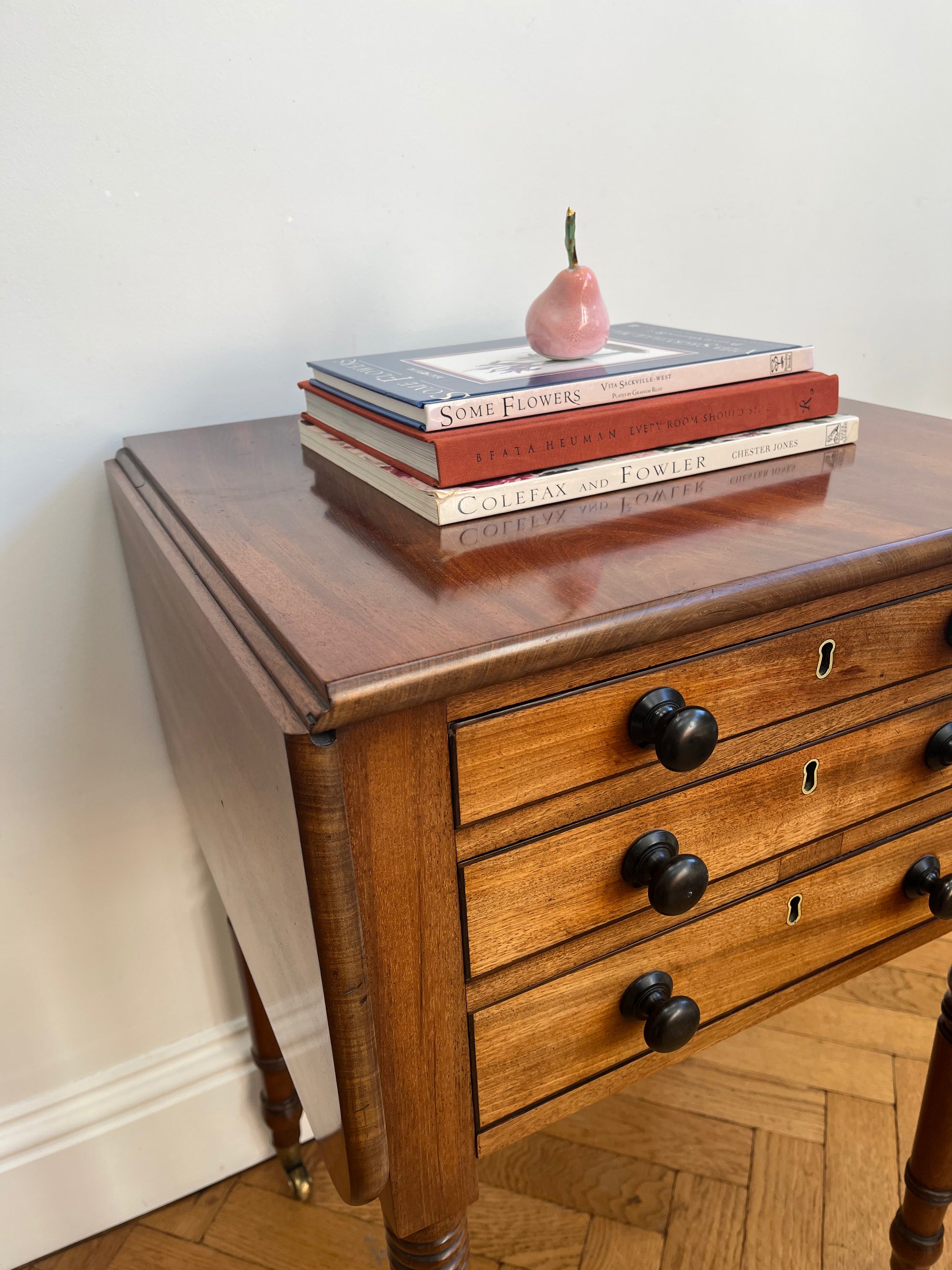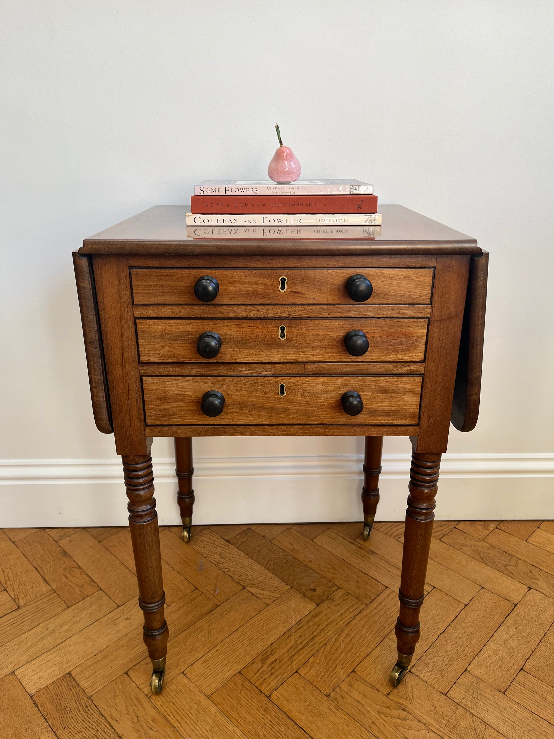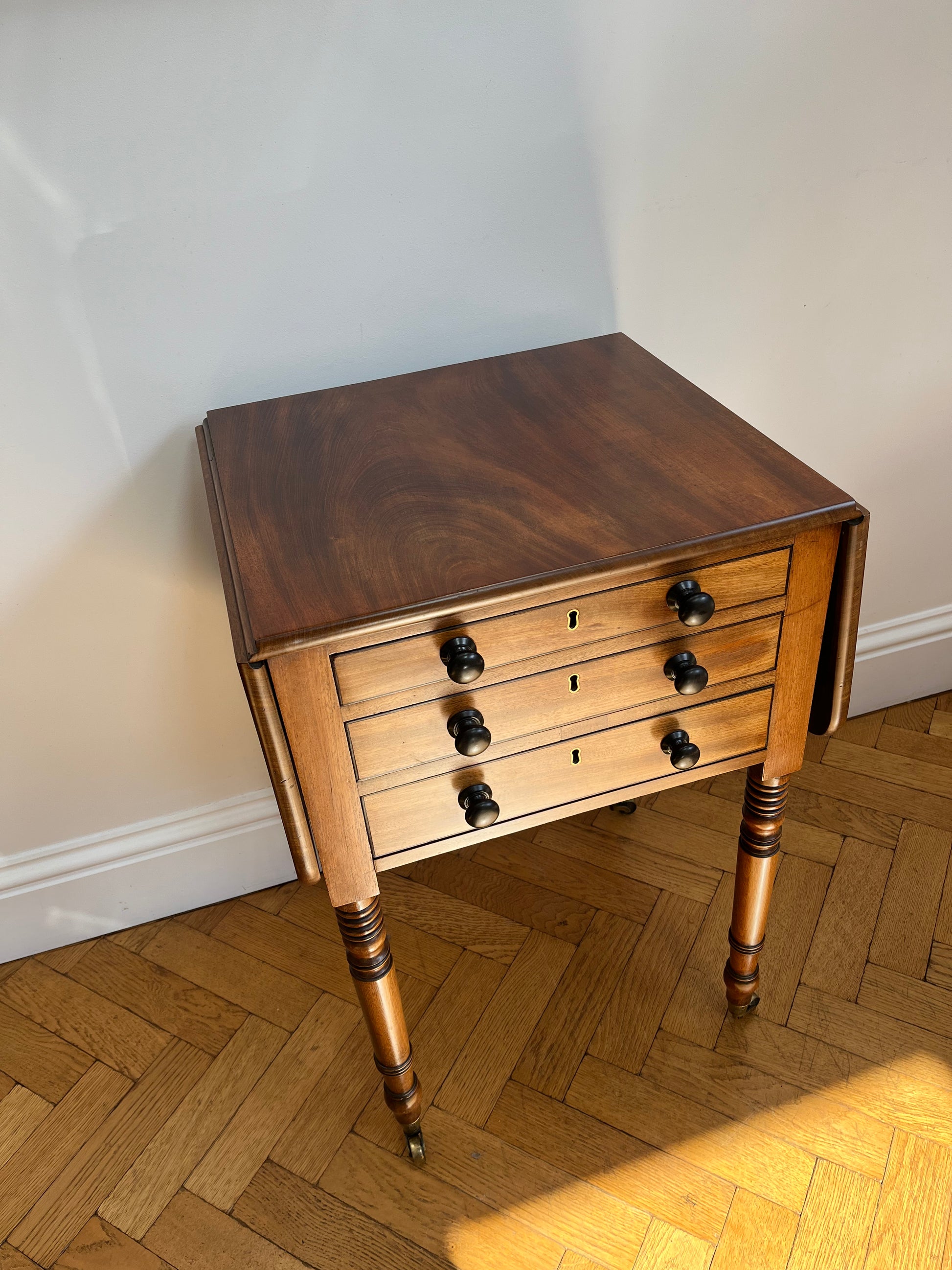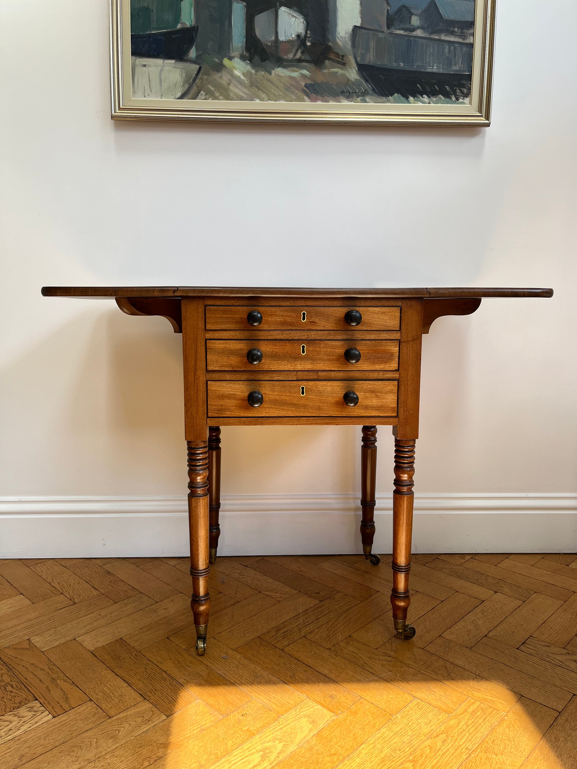 A Victorian mahogany drop-leaf Pembroke table with three drawers and three dummy drawers, on turned column supports and terminating on brass castors.