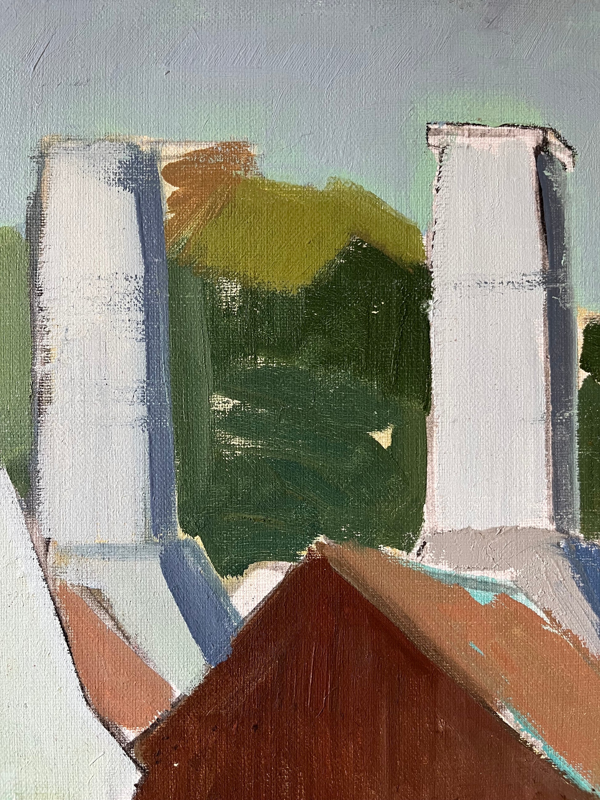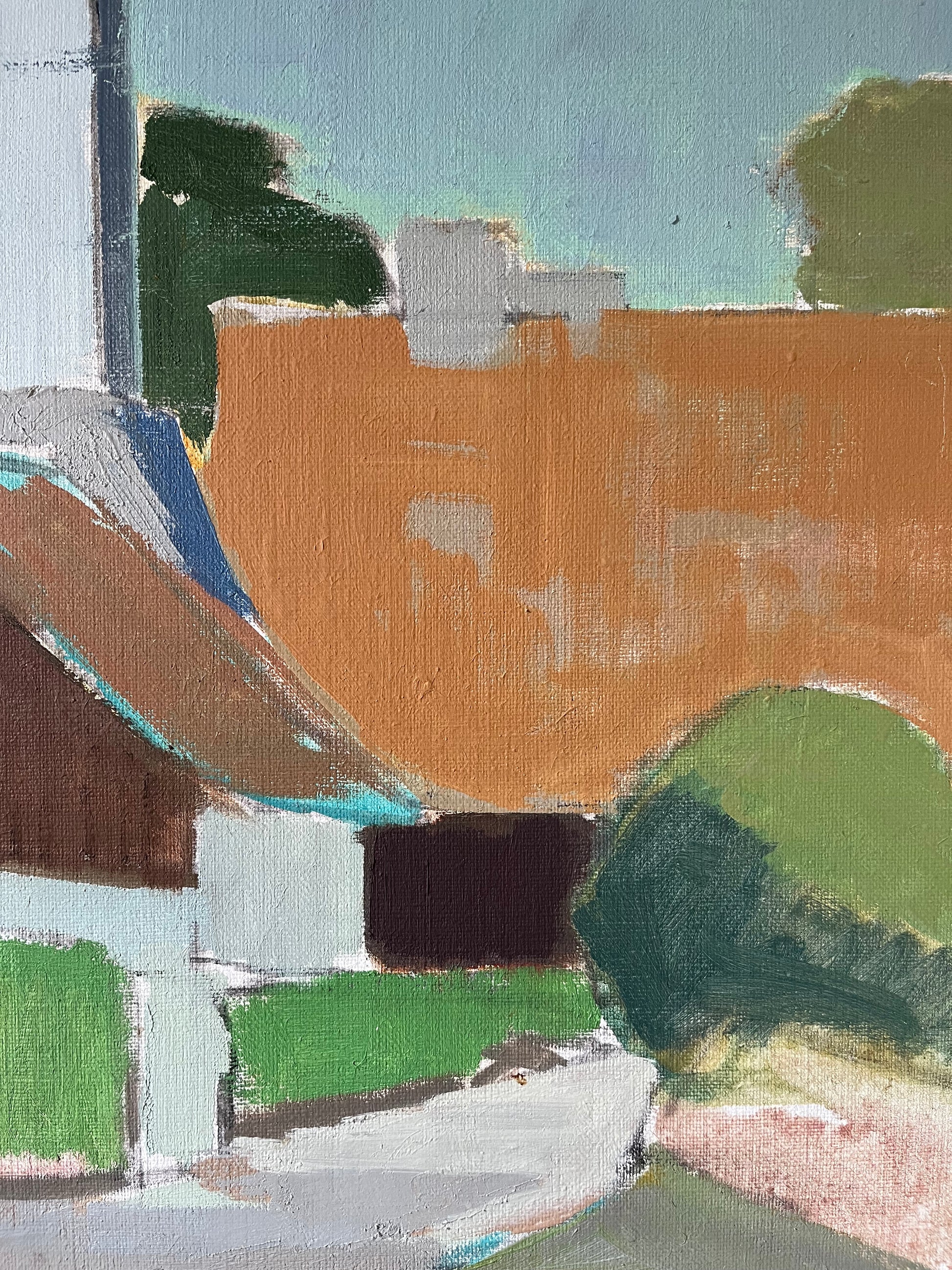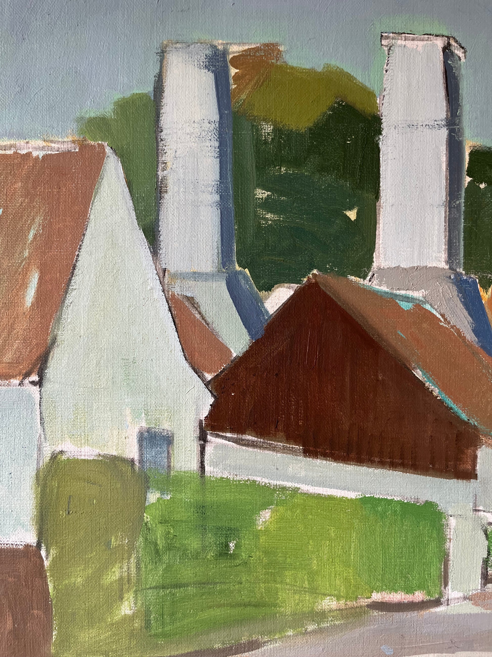 Beautiful landscape oil on canvas of a pretty little village. GREAT colour combinations - particularly the brown.